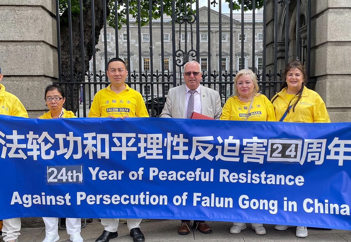 七月十二日,爱尔兰法轮功学员在国会伦斯特府(Leinster House)前集会,呼吁民众共同制止中共对法轮功的迫害。活动当天多位爱尔兰议员到场签名支持。