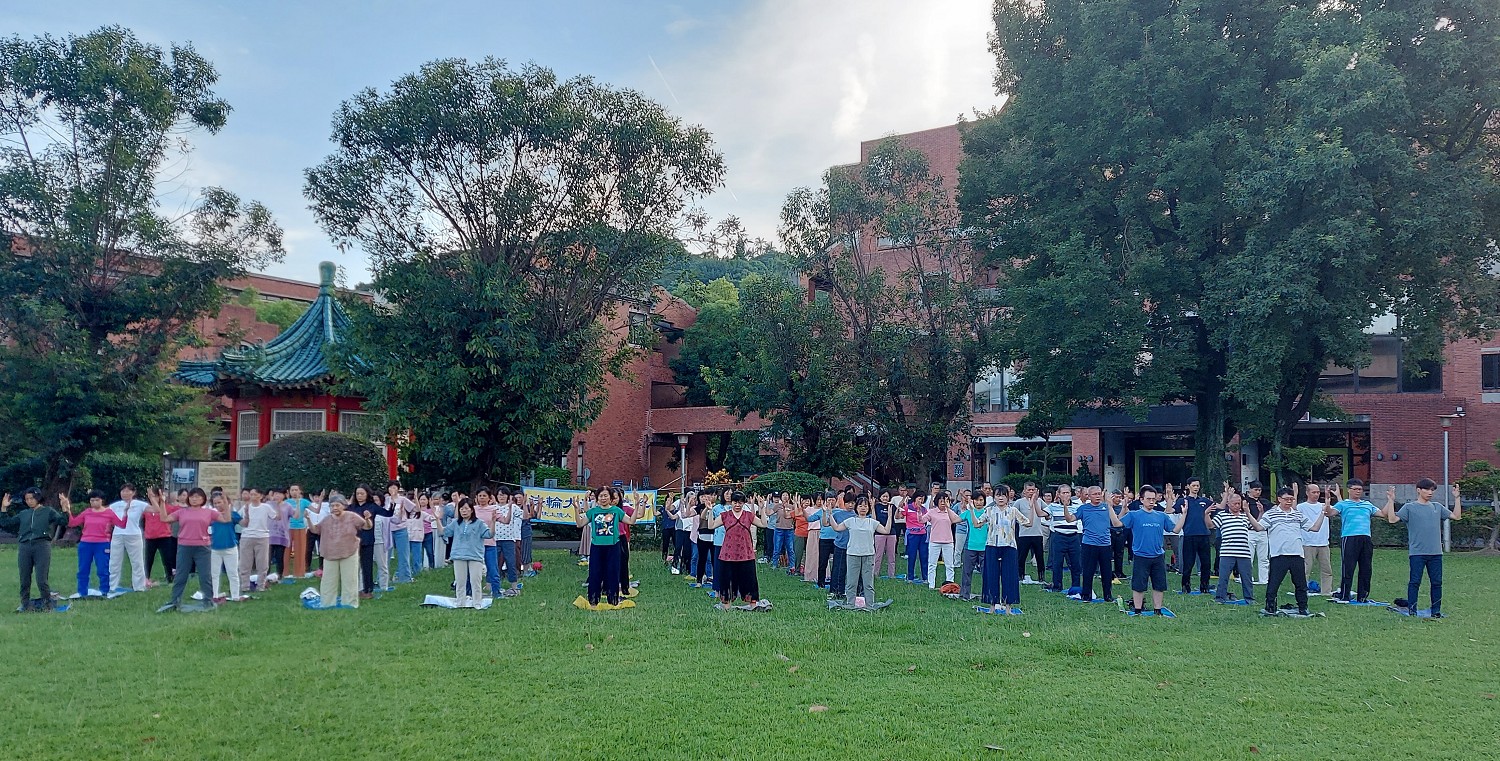 图1~2:二零二三年七月三十日清晨,来自台湾各地的法轮功义务辅导员在台北剑潭青年活动中心集体炼功。
