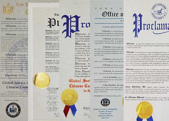 全球退党服务中心倡议把每年的七月一日定为“退党日”,七月定为“退党月”。今年退党日前后,纽约长岛多县市及州议员向全球退党服务中心发来贺信和褒奖,全球有4.16亿中国人退出中共党、团、队。