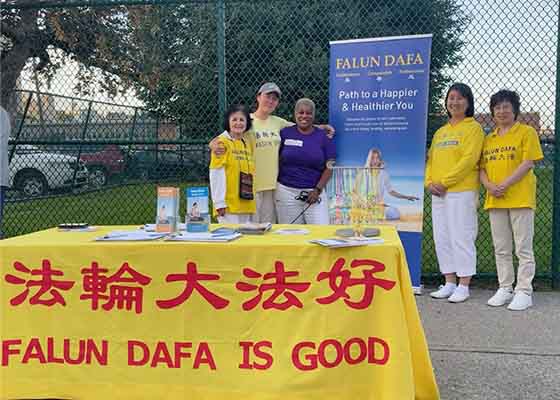 八月一日,法轮功学员参加了在奥本尼的南端小区举办的“全美警民之夜”活动。法轮功的展位处在街区的入口处,金黄色的展位在阳光下十分醒目。