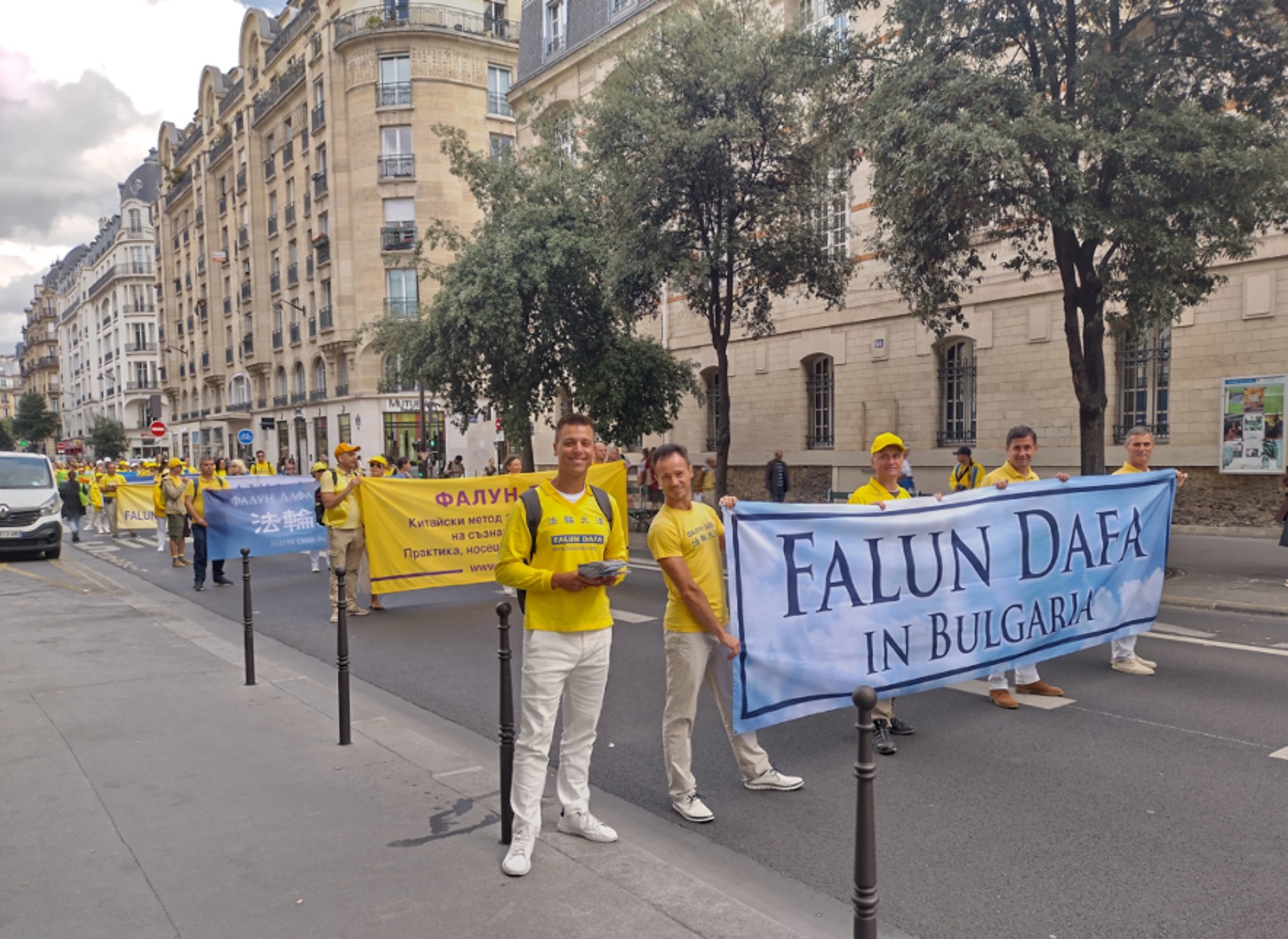 八月二十六日,保加利亚各地的学员前往法国巴黎,与一千四百多名欧洲学员们一同参加法会之前举办的集会游行活动,向人们传播法轮功的美好。