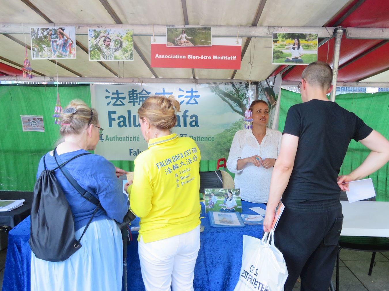 在巴黎五区,法轮功展位设在市政府里面。法轮功学员演示五套功法时,吸引了许多居民前来了解有关修炼打坐的更多信息,同时有更多人了解法轮功和中共迫害法轮功学员的真相。来到法轮功展位的人们都带着灿烂的笑容和真相资料离开。