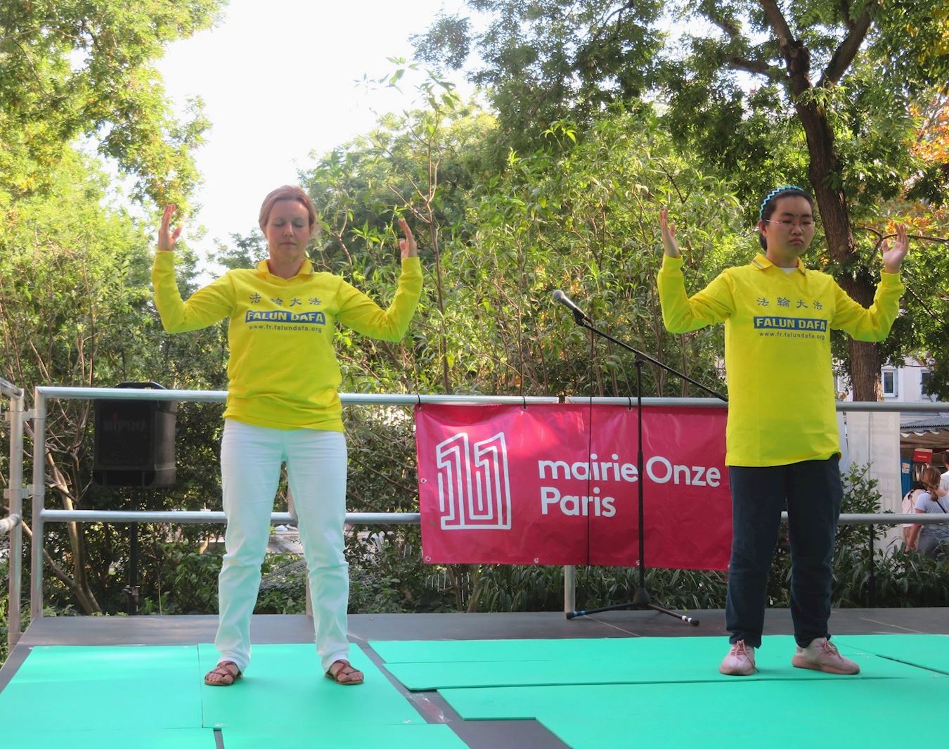 ![]() 图6~7:法轮功学员在巴黎十一区协会论坛活动上向参观者演示法轮功功法。 |