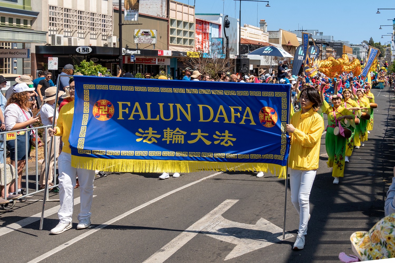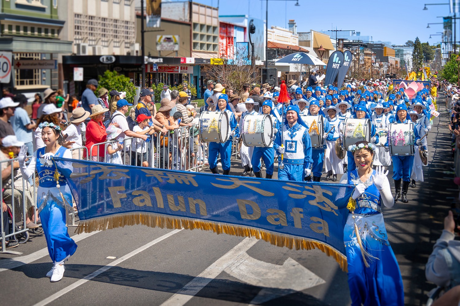 法轮功游行队伍由法轮功天国乐团引领,《法轮大法》的横幅,金光闪闪。来自悉尼、墨尔本身穿中国古典乐团服饰的天国乐团成员,演奏了多首雄壮有力的乐曲,《法轮大法好》、《凯旋》和《神圣的歌》。演奏的乐曲雄壮悦耳、振奋人心。向沿途观众传递着大法的美好,人们纷纷鼓掌、喝彩并拍照留念。