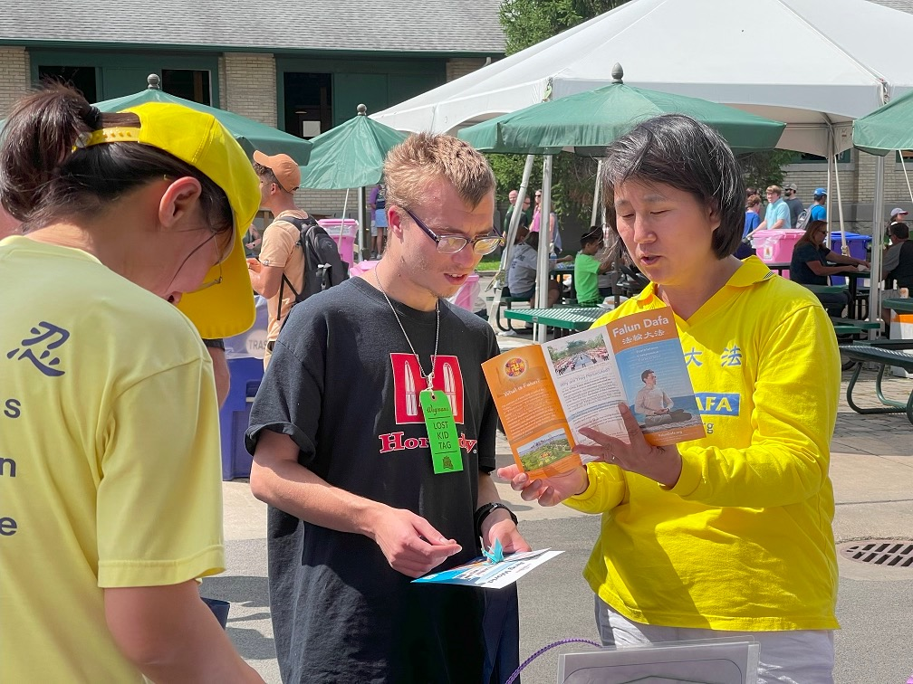 一位中年父亲和他的女儿在法轮功展台前停留了很久,他说他太太在网上教中国大陆的孩子学英文,所以他对中国现状有些了解,但还没听说过法轮功。他认真听学员讲述了法轮功强身健体的功效和中共迫害法轮功学员的情况,以及中共活摘法轮功学员器官所犯下的罪行。他表示希望自己和美国人能为在中国受难的法轮功学员做些什么。他在反迫害请愿书上签了名,拿了一份揭露中共活摘器官的真相资料,并为他的太太拿了一份《九评共产党》报纸。