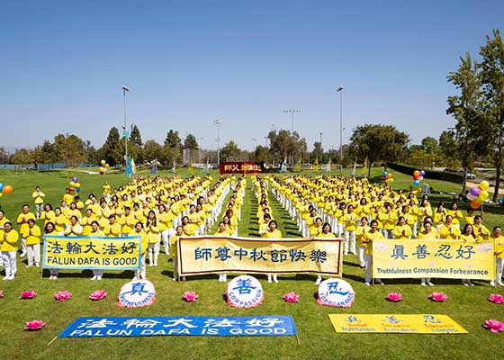 九月二十四日上午,中秋佳节来临之际,部分洛杉矶法轮功学员数百人相聚在加州橙县芳泉谷,恭祝师尊中秋节快乐。