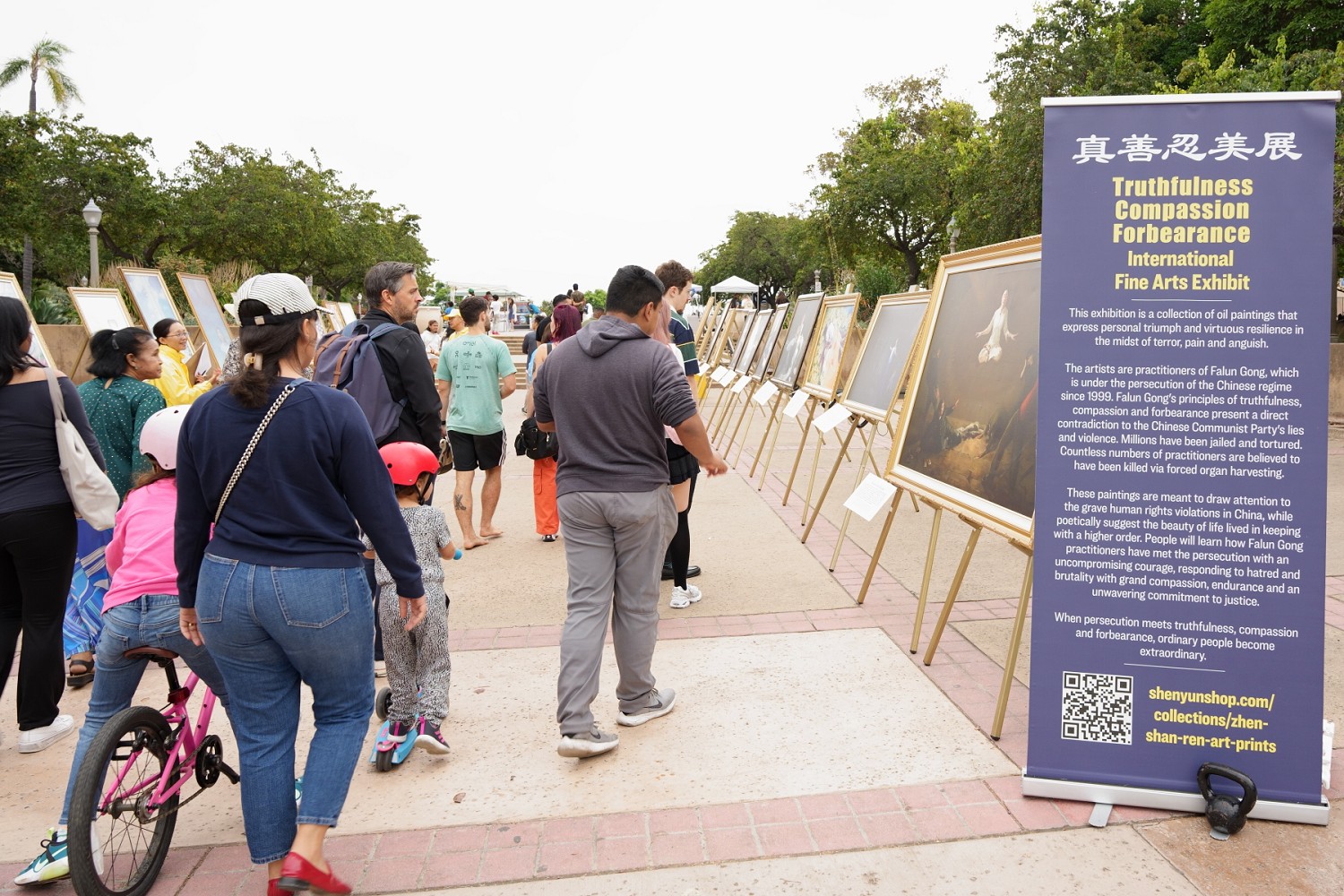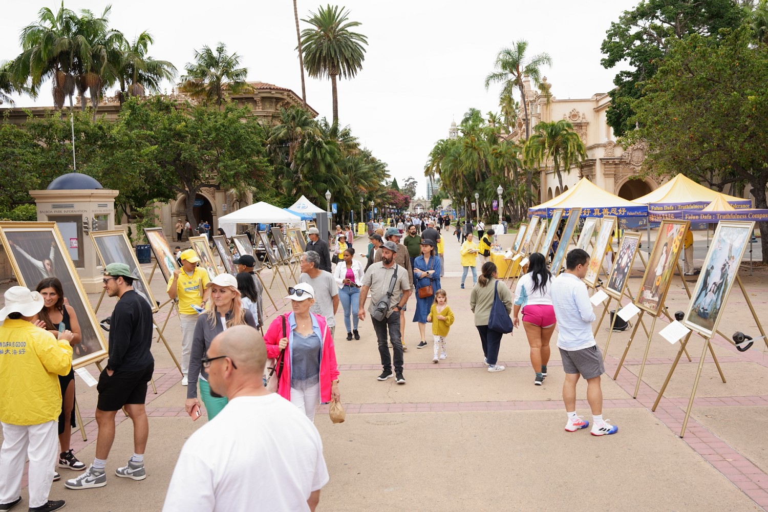 加州圣地亚哥是旅游胜地。当天天气晴朗,前来巴博亚公园游玩的人流川流不息。游人们经过美展时,许多人被画作吸引,驻足观赏。