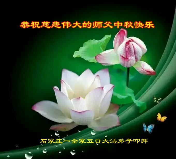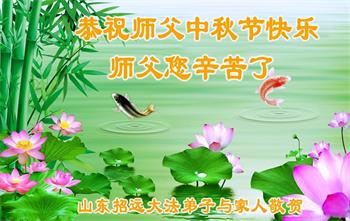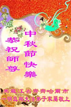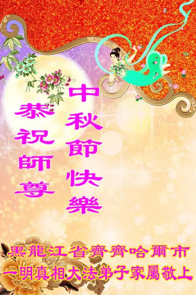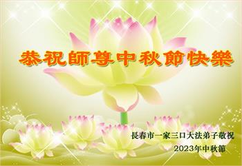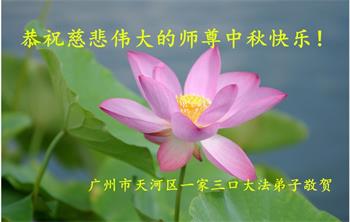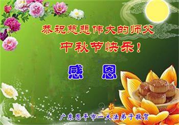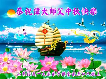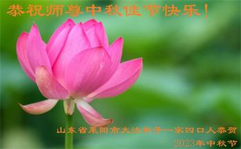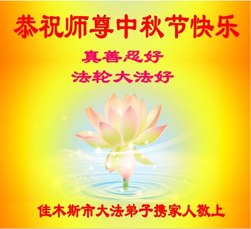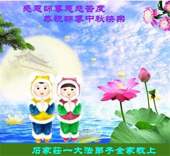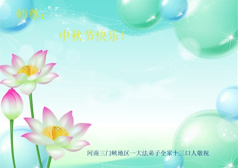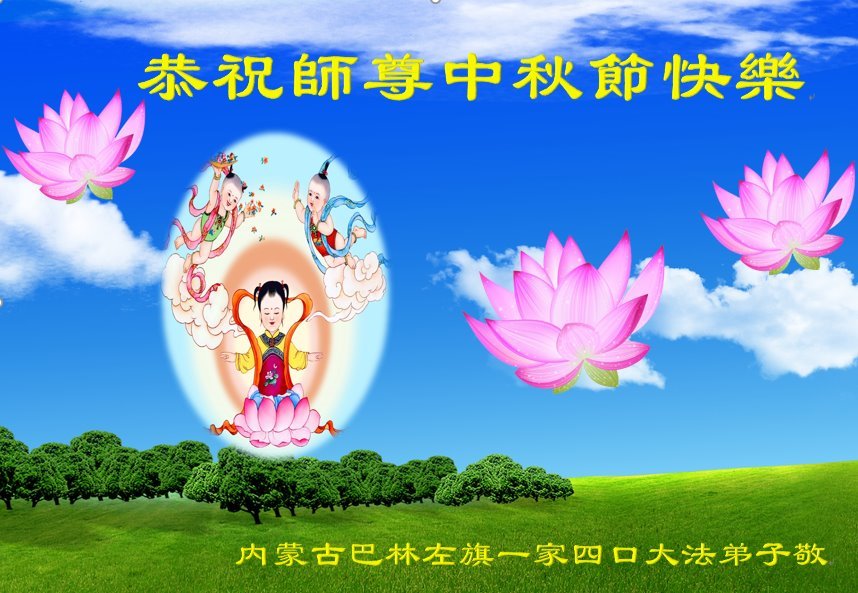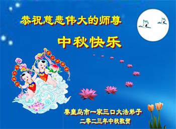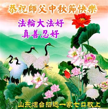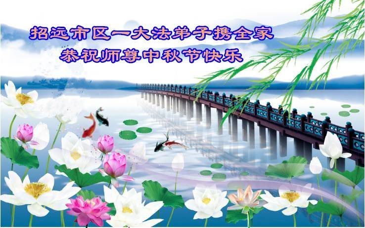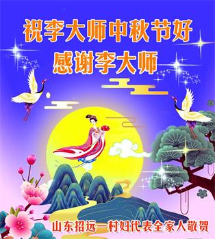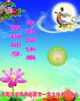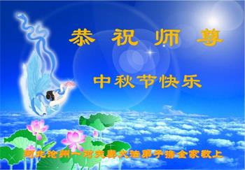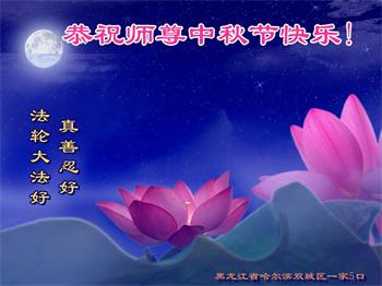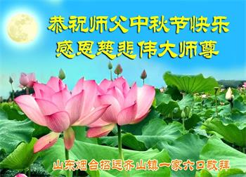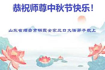 我们家还没有修炼法轮功,但是,我们全家人都知道法轮功是个好功,是教人做个好人,能使身体健康无病的。我们亲戚有炼法轮功的,邻居也有炼的。他们修炼后,变化都很大,是大家公认的好人。这些年,打压这么厉害的情况下,他们不怕死,不怕抓,仍然坚定的修炼法轮功,我们从心里佩服,现在社会上这样的人不多。都是李大师好,才能教育出这么些好徒弟。这些年,因为我们相信法轮功好,帮助法轮功学员躲避迫害,也得到李大师的保护,全家老少身心健康,工作顺利,生活的幸福快乐!我们从心里感谢李大师的恩情。我们全家人恭祝李大师中秋节快乐!李大师您辛苦了!