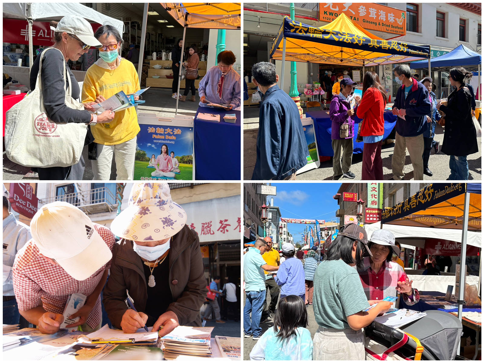 图1:二零二三年九月二十三日和二十四日,法轮功学员在旧金山中国城中秋街会中设立摊位,传播法轮功真相及帮助中国人三退。