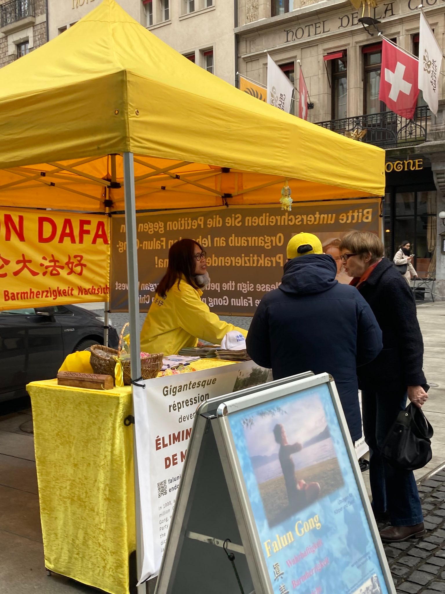二零二四年一月二十二日和二十三日,除了在万国广场(Place des Nations)上的弘法活动,另一些法轮功学员们在市中心的朗热马勒广场(Place Longemalle)也展开了弘法的活动。