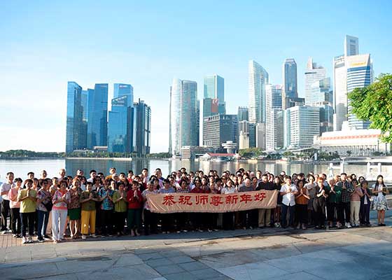 一月二十一日,新加坡法轮功学员齐聚滨海艺术中心前,在著名的景点新加坡河畔,向法轮功创始人李洪志大师拜贺新年好。