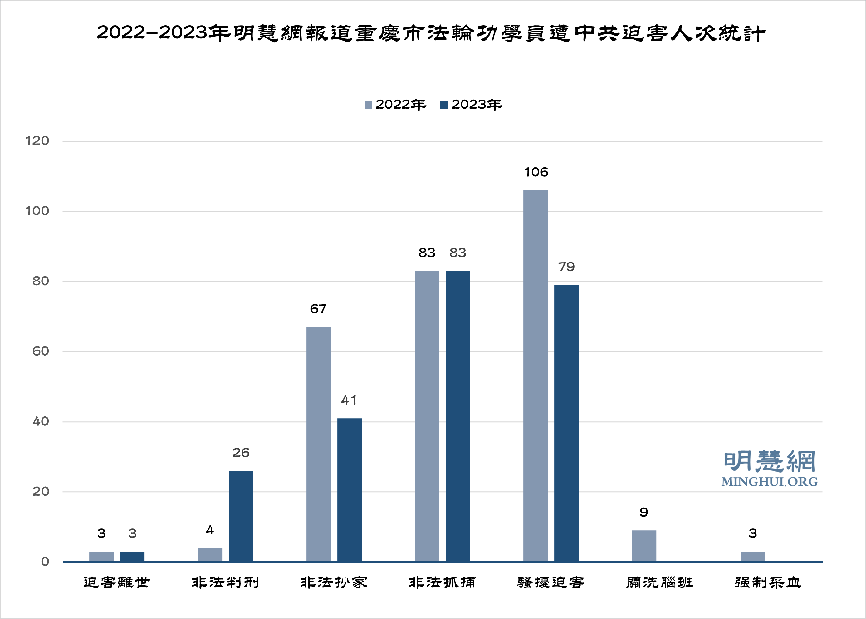 【明慧网二零二四年一月三十一日】(明慧网通讯员报道)据明慧网报道的信息统计,二零二二年和二零二三年,重庆市法轮功学员因为信仰真、善、忍,被中共当局迫害,至少30人被非法判刑,166人次被绑架,185人次被骚扰,9人次被洗脑班迫害,6人被迫害离世;总计至少396人次被迫害。被绑架和骚扰的法轮功学员中,至少108人次被非法抄家(搜身等),3人次被强制抽血(录指纹等)。由于中共对真相的封锁、不允许家人探视、暗地迫害等原因,还有许多没有报道出来的迫害事实。