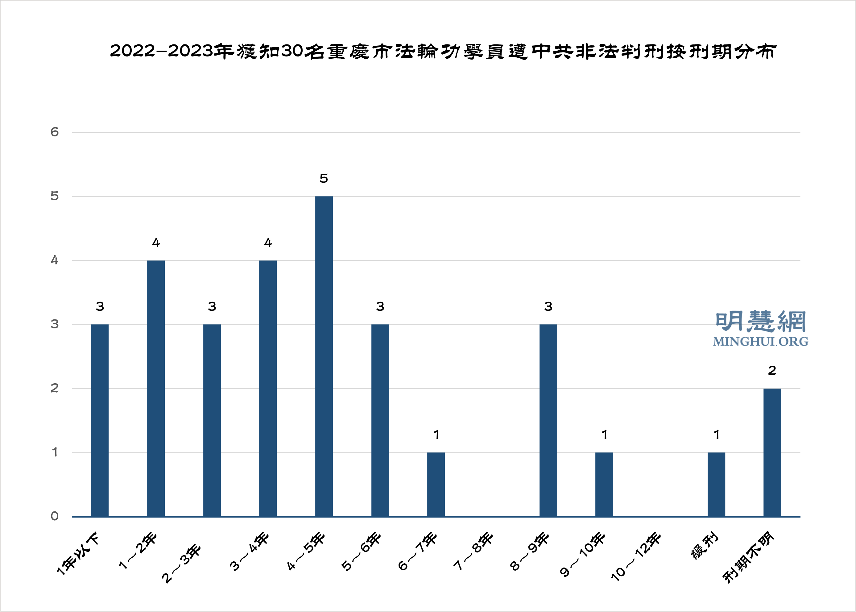 图2:2022-2023年获知30名重庆市法轮功学员遭中共非法判刑按刑期分布