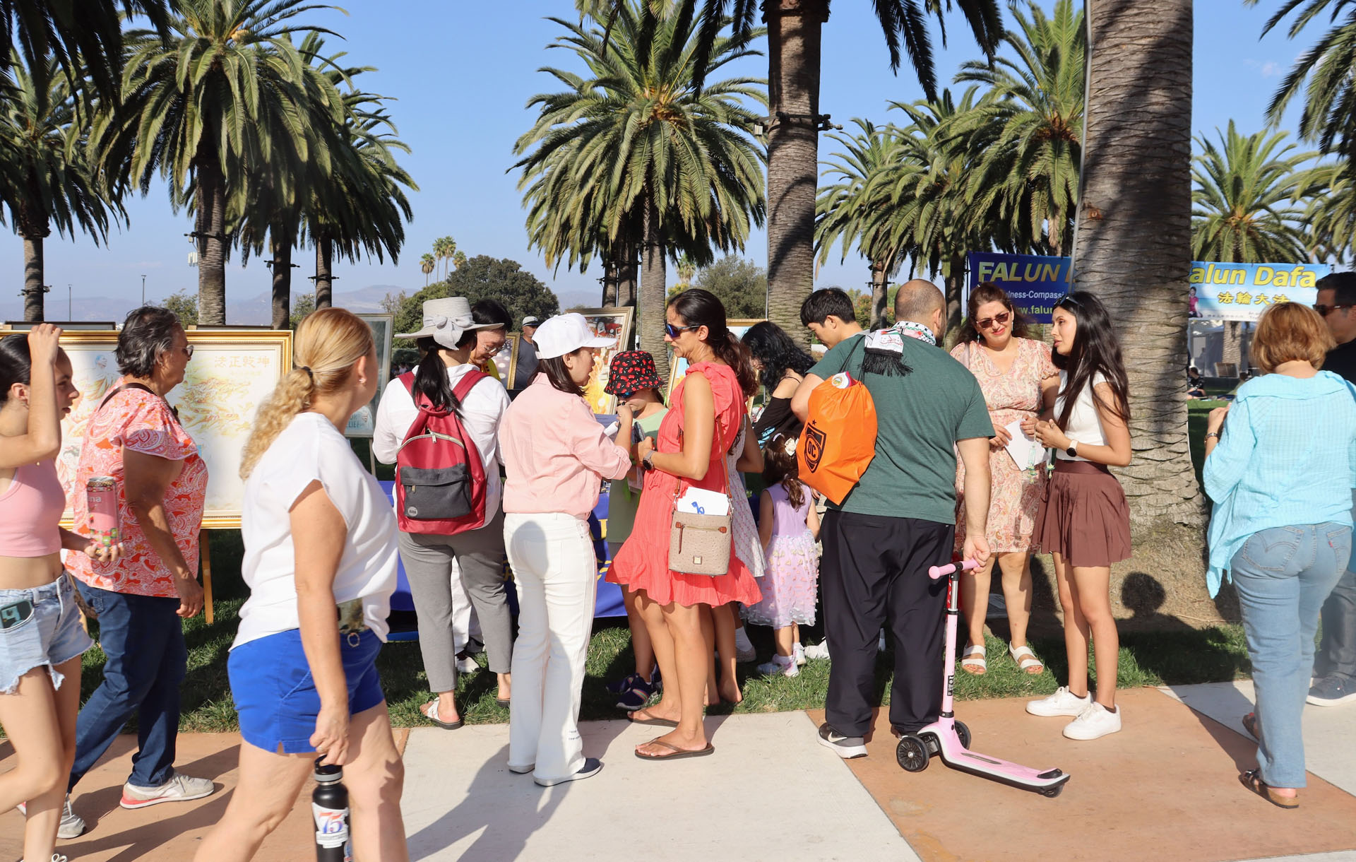 在主入园口旁的草坪上,橙县法轮大法学员们再次布置了“真善忍美展”;一些学员伴随着祥和宁静的音乐炼功,向络绎不绝的游客展示五套功法。