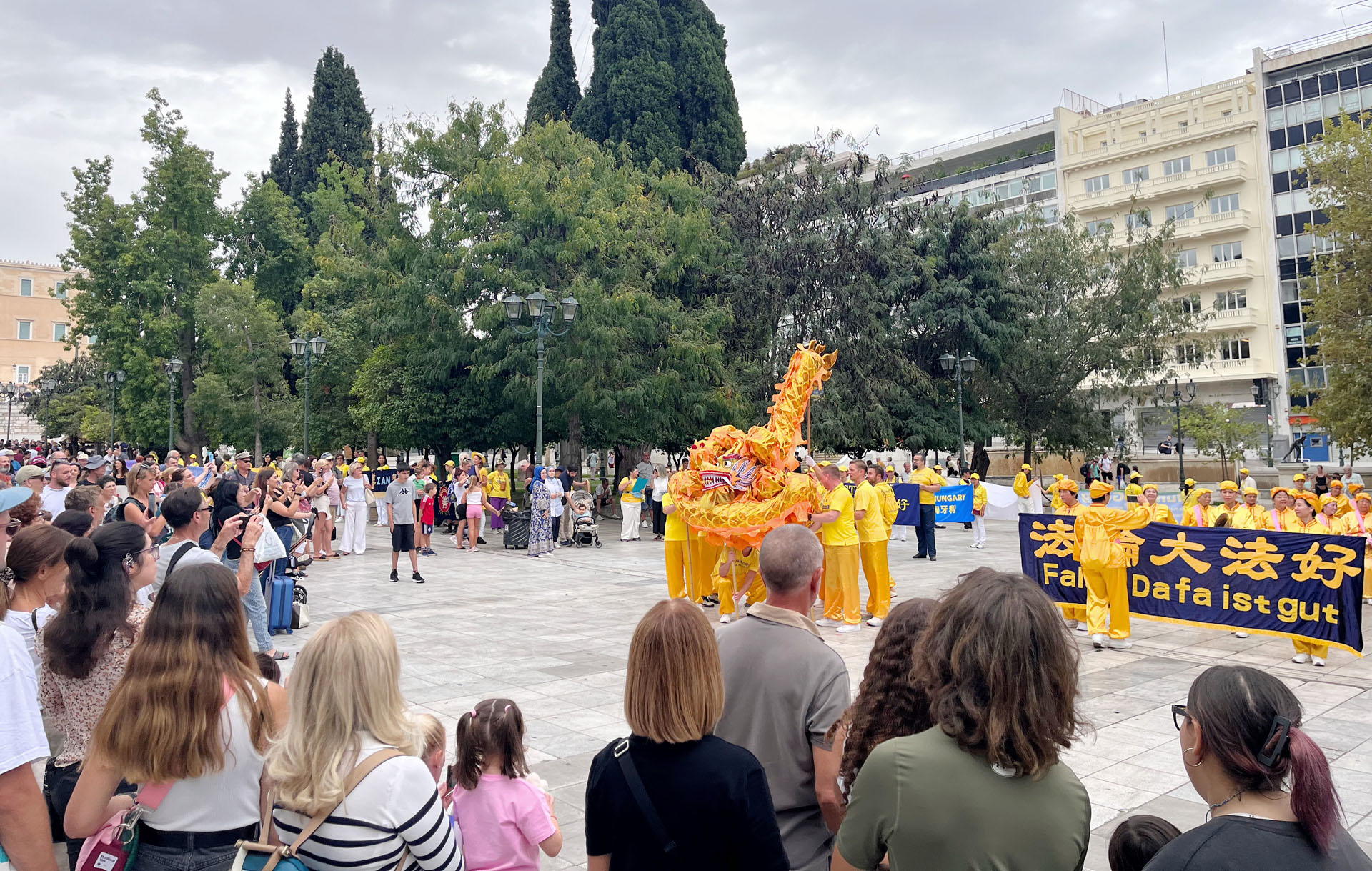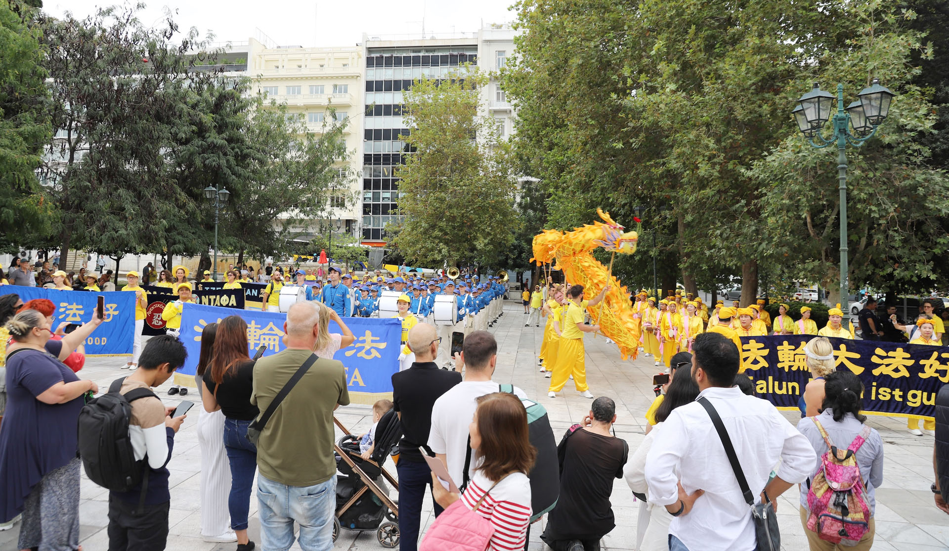 法轮功学员连续两日的游行,每日上午十一点三十分和下午五点开始,由欧洲天国乐团引领,翻腾的金龙紧随其后,之后是横幅方阵和腰鼓表演。每次都是,从柯基亚广场(Kotzia Square)出发,沿斯达迪欧大街(Stadiou Street)到达宪法广场(Syntagma Square),再由名品购物街(Ermou Street)行进至蒙纳斯提拉齐广场(Monastiraki Square),最后途经古雅典阿格拉遗址(Ancient agora of Athens)抵达瑟赛欧步行街(Thissio Station)。
