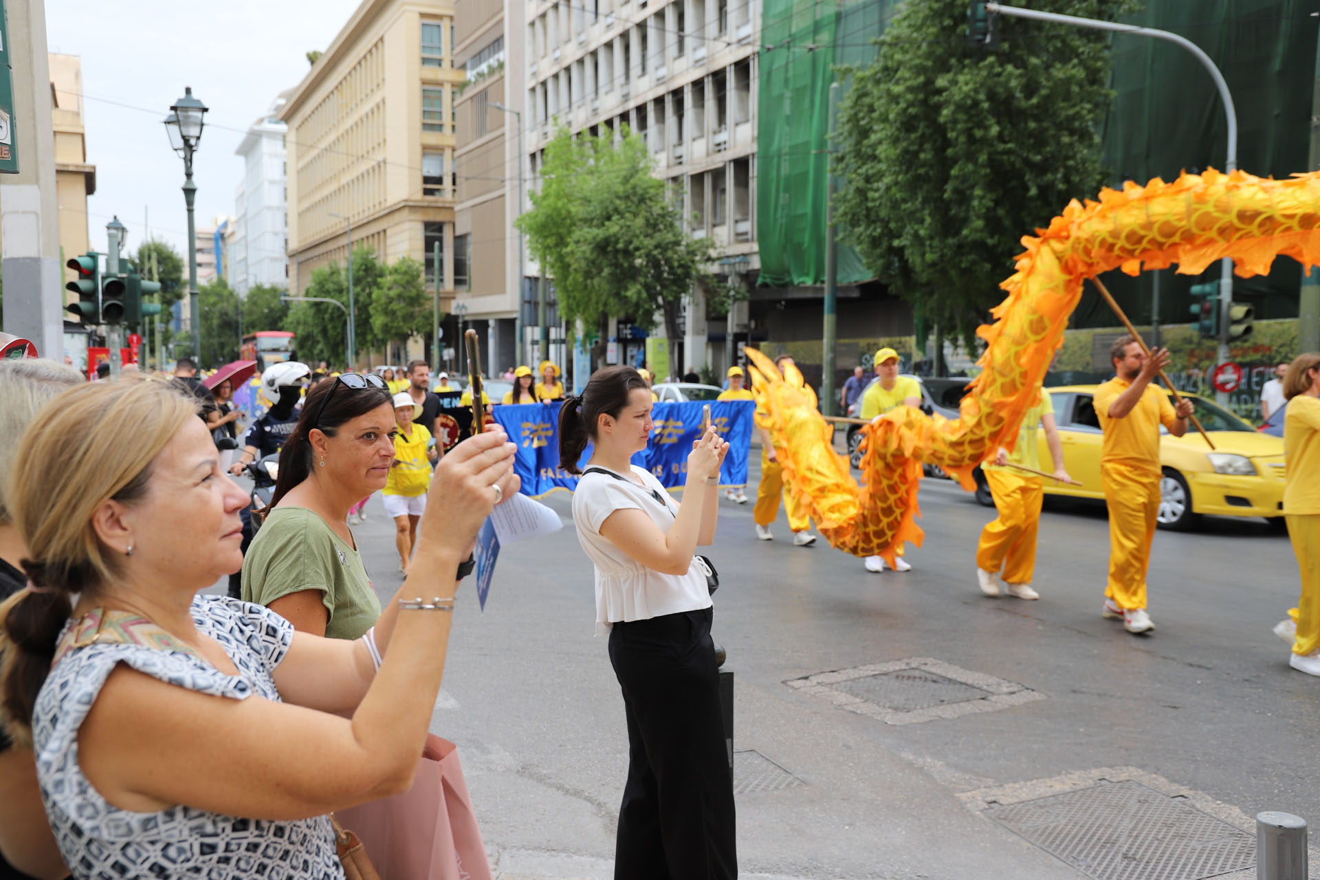 游行队伍所经之处,都是旅游胜地或著名商业街,行人游客众多。看到学员的游行队伍,许多人拍照、鼓掌、挥手、欢呼和竖起大拇指。当队伍在宪法广场和蒙纳斯提拉齐广场简短停留时,由法轮功学员代表向市民及游客介绍法轮功,并揭露中共迫害法轮功的罪恶。