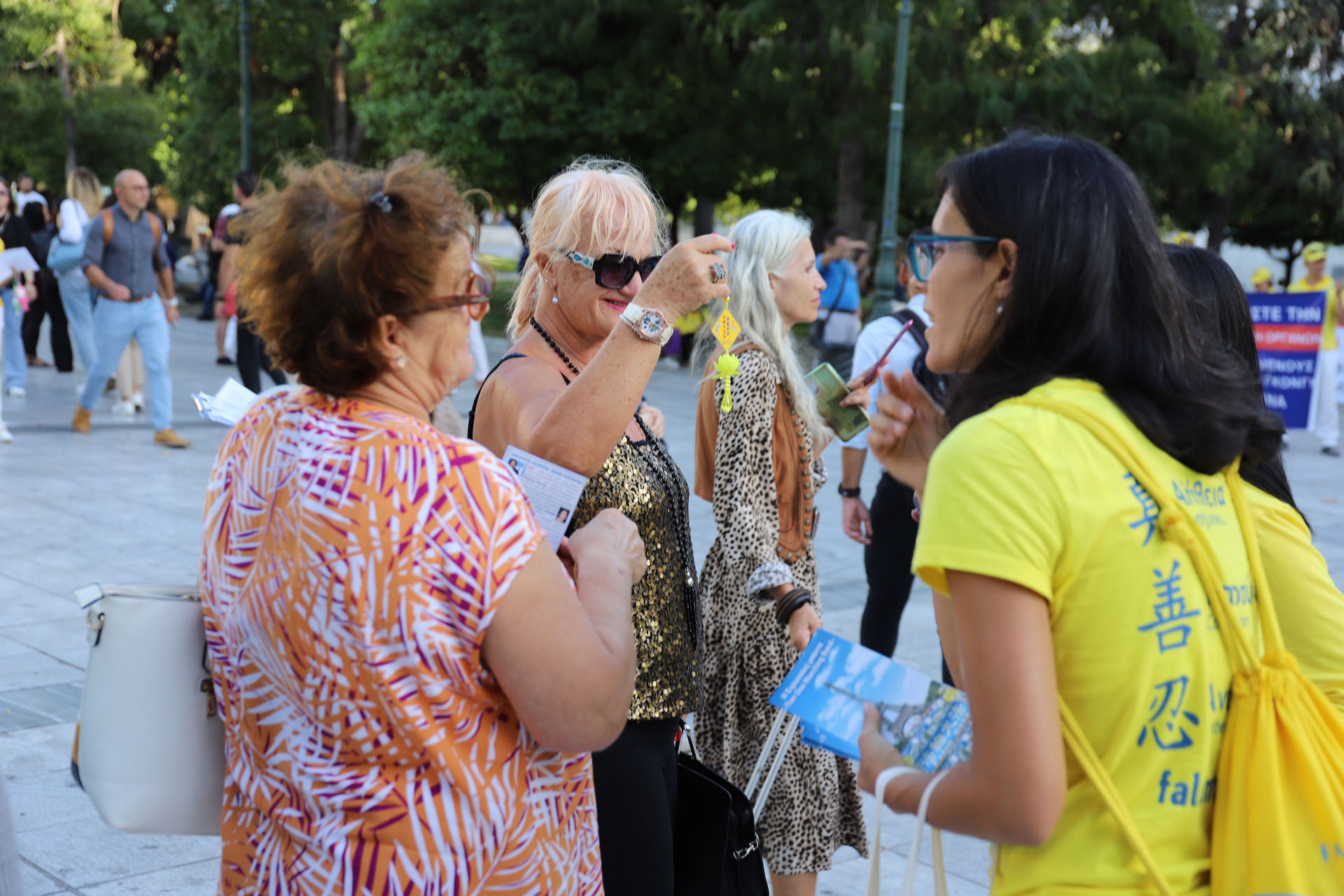 来自西班牙的洛萨(Rosa)女士一家来希腊度假。他们在宪法广场看到了游行队伍的表演和演讲,并收下了学员送的小莲花。洛萨女士觉得法轮功学员的活动“非常壮观”。