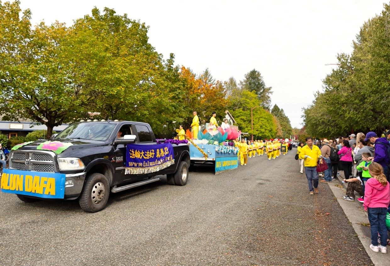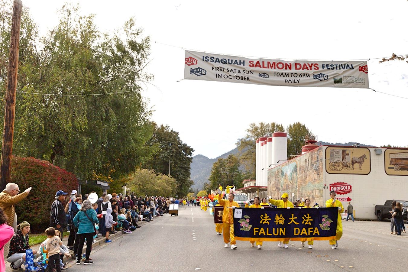 伊萨夸市也有很多华人居民,他们惊喜地看到法轮功队伍展现在眼前,其中有一家五口中国人在看到法轮功队伍后非常高兴,他们开心地接过了介绍法轮功的单张,并欣喜地念着“法轮大法”。