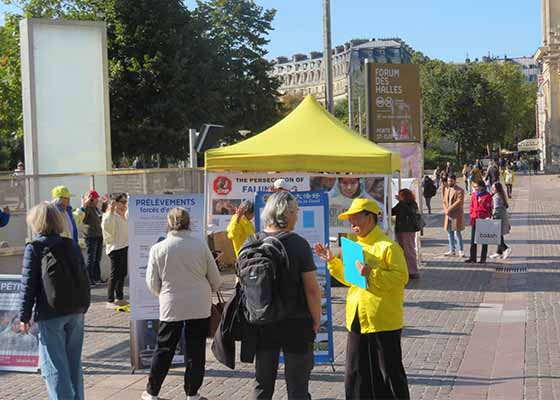 十月十一日,法轮功学员再次来到巴黎市中心的夏特莱街区,向游客和当地民众演示法轮功功法,介绍法轮大法,并揭露中共对法轮功的迫害。