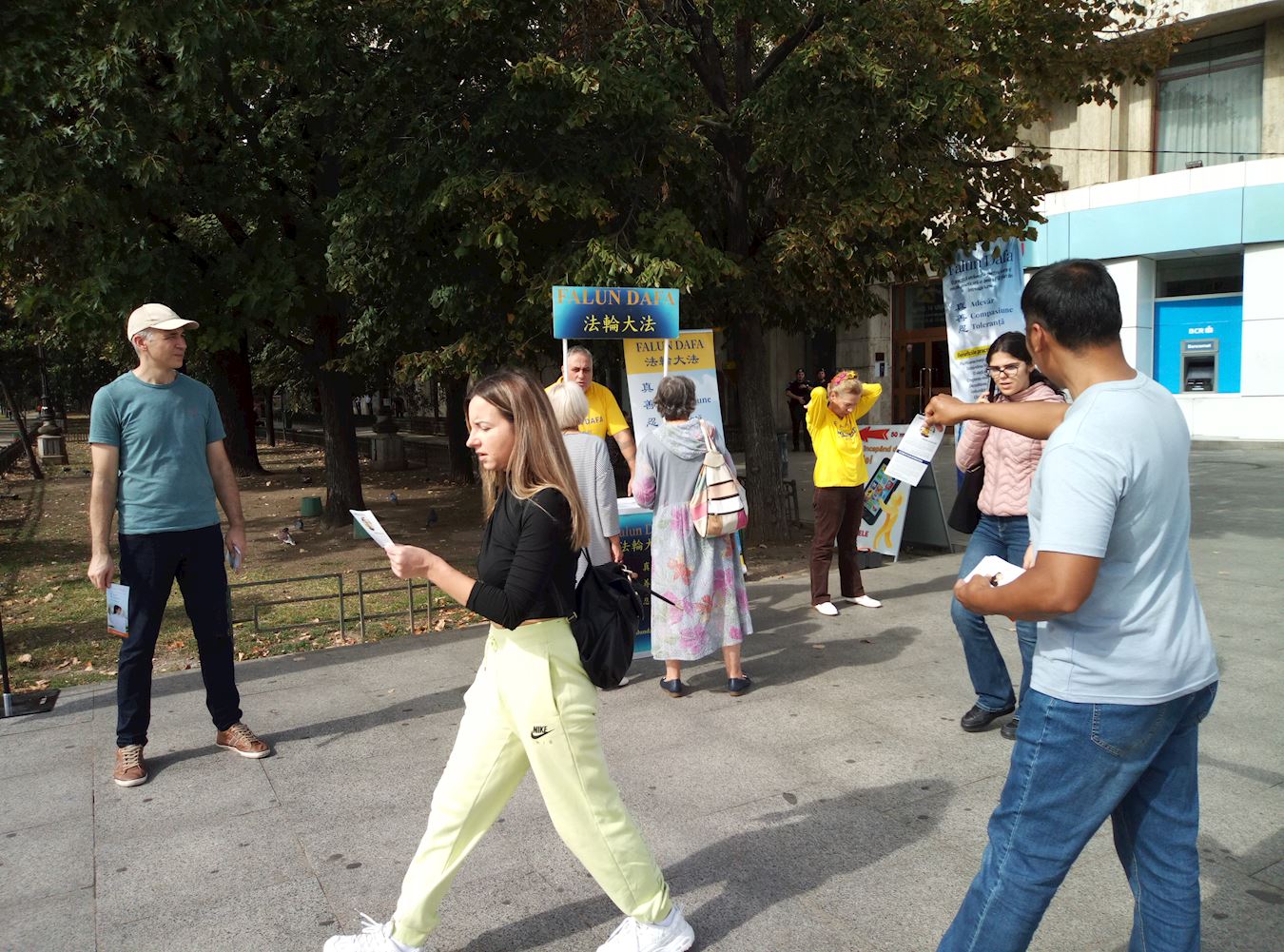 十月五日,两位女士径直走到布加勒斯特的法轮大法展位前,询问这是否就是法轮功。当学员确认后,其中一位女士表示,她很早就知道这个修炼方法。