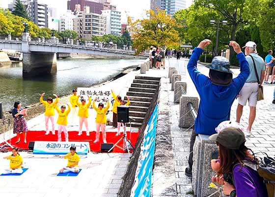 十月十四日,日本广岛法轮功学员在游客聚集的广岛和平公园参加了水滨音乐会,并集体炼功,展现法轮大法的美好。