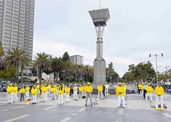 - 哥伦布日长周末 旧金山游客了解法轮功真相- 十月十二日,旧金山湾区的部份法轮功学员聚集在旧金山渡轮大厦前的广场,集体炼功。吸引了许多过往行人的目光。