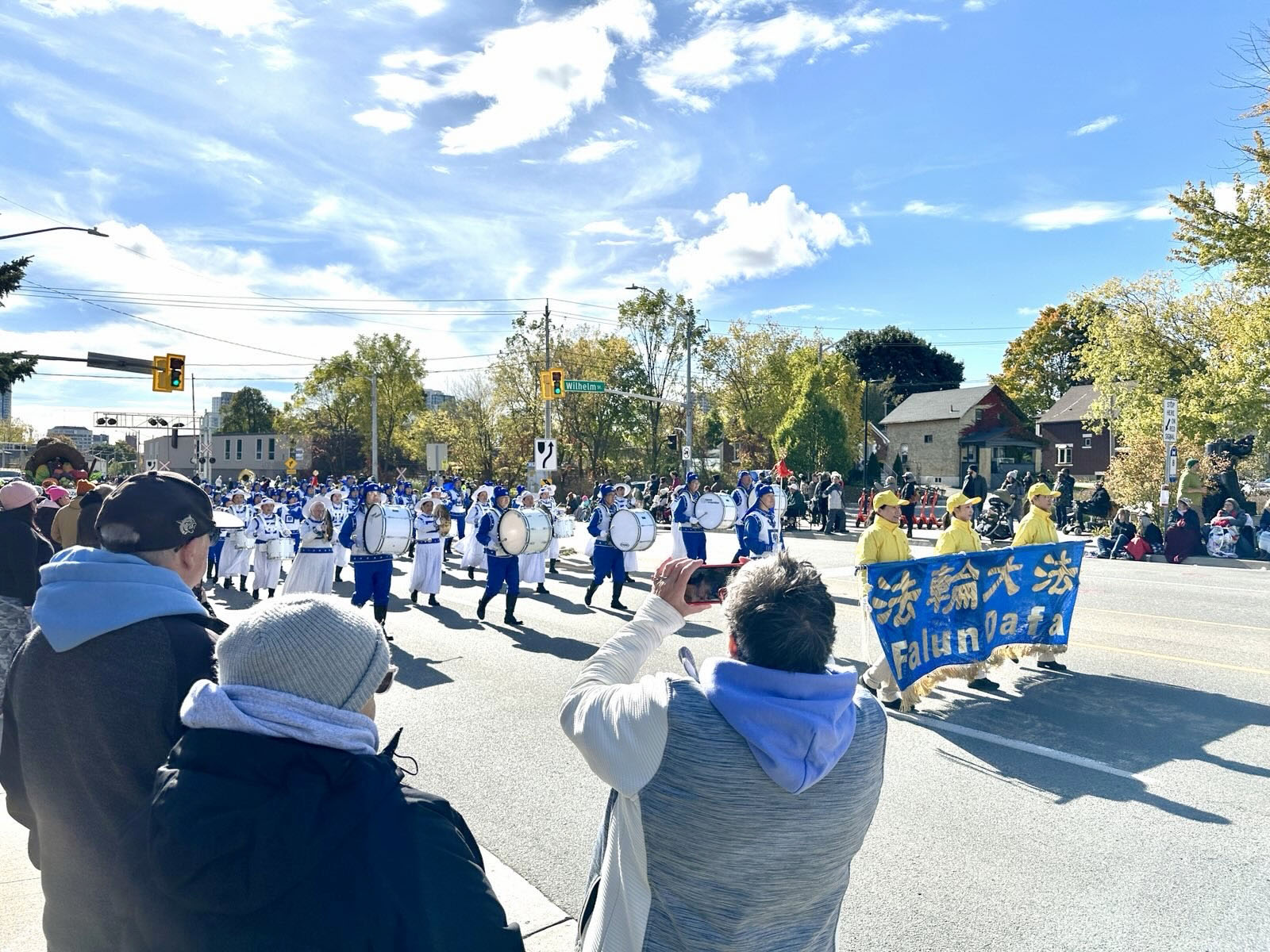 艾莉森(Alison)和她的家人来自安大略省的剑桥市(Cambridge),这次特意来基奇纳观看感恩节大游行。当法轮大法天国乐团方阵经过时,艾莉森便开始拍照、录像。