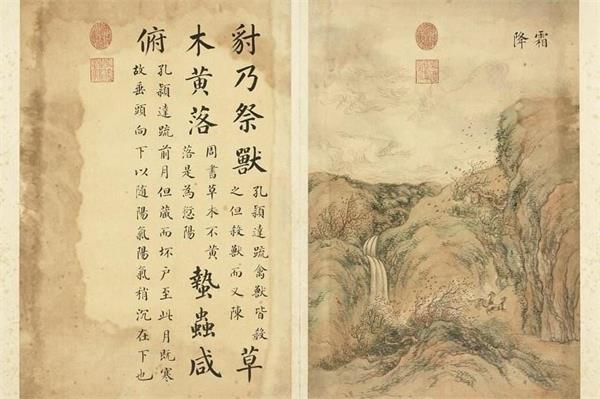 ![]() 唐代诗人元稹的“风卷清云尽,空天万里霜。”形容了霜降节气的特点:北风卷起清云而去,空天万里披上了早霜。(清《允禧山水・册・枫叶霜林》,台北故宫博物院) |