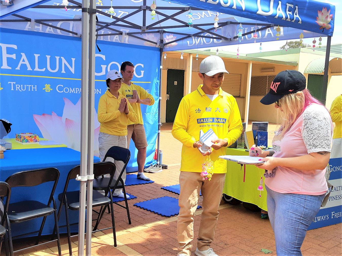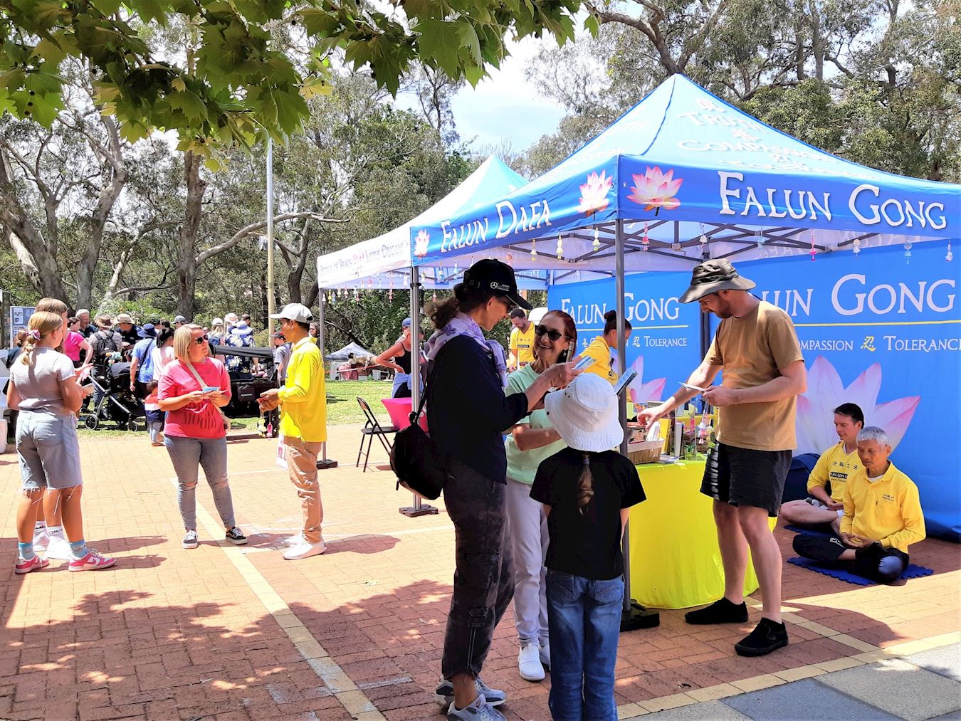 西澳法轮功学员在博览会上设立了法轮大法展位。人们驻足观看功法演示,并向学员询问,了解法轮功。在制止中共迫害的征签簿上,人们签名支持法轮功学员反迫害。不少人对学炼功法很感兴趣,并询问当地炼功点。