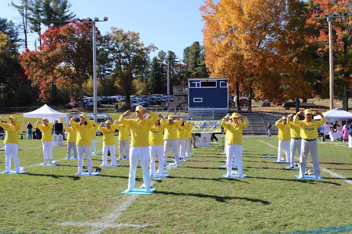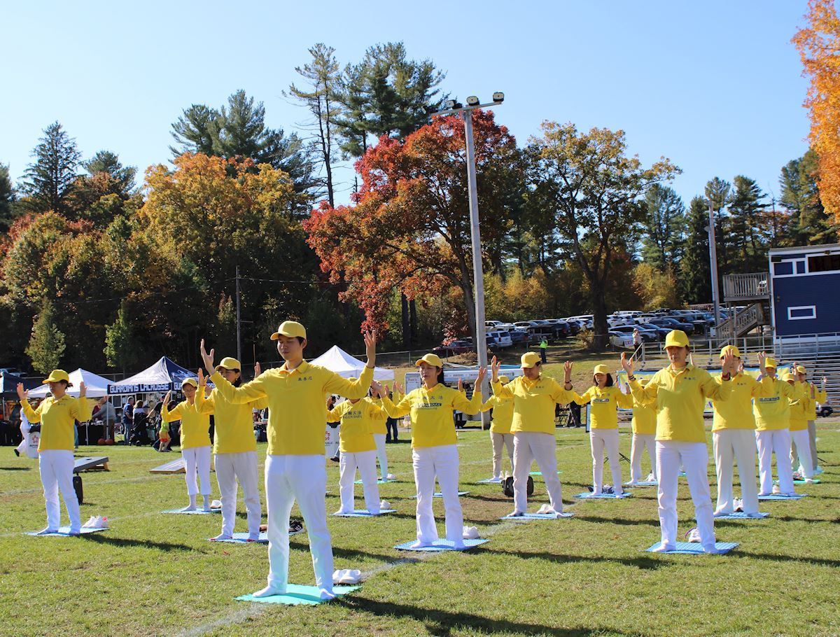 当天天气晴朗,风和日丽,法轮功功法展示作为主办方设定的秋季节活动的第一个节目,于上午十一点准时登场。法轮功学员们身着黄色大法衫,黄色帽子,白色裤子聚集在活动的中心的绿色草坪上,在蓝天白云及满山秋色的映衬下,“法轮大法好”的横幅迎着微风飘展,伴随着悠扬的法轮功炼功音乐,学员们整齐划一的完整展示了法轮功动功的四套功法和第五套功法打坐。