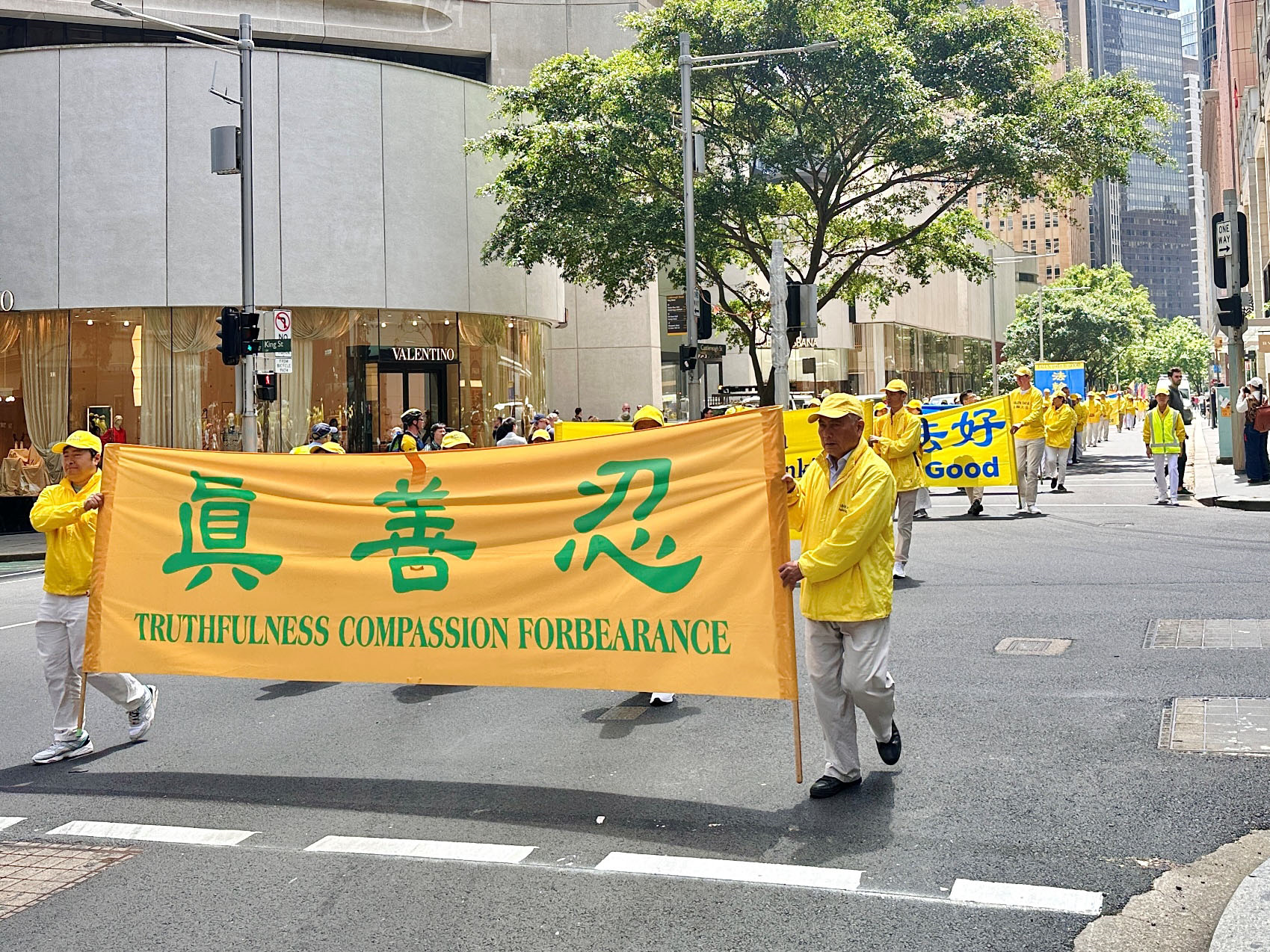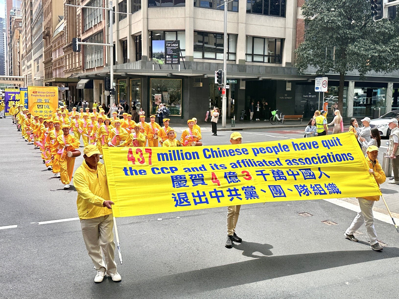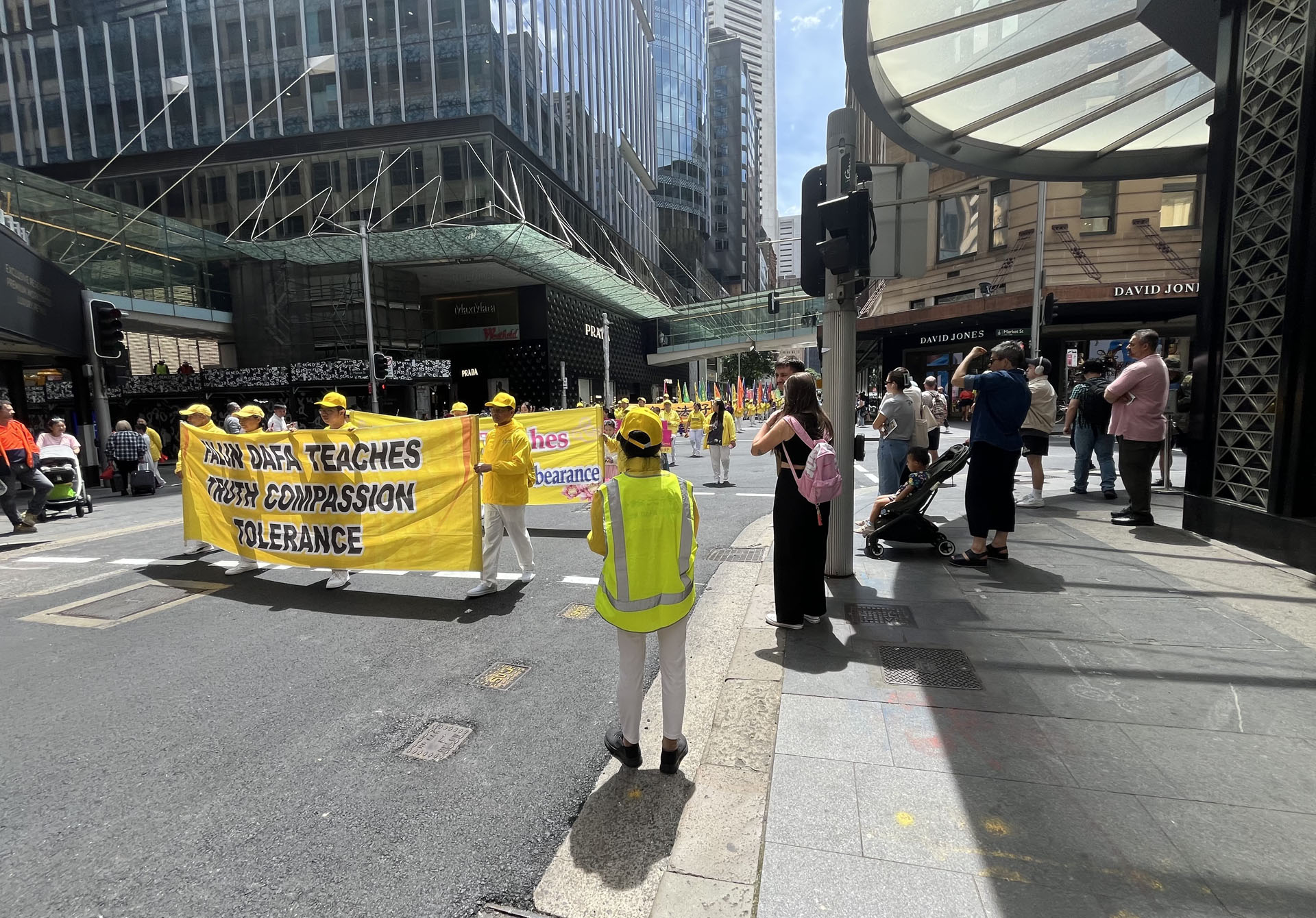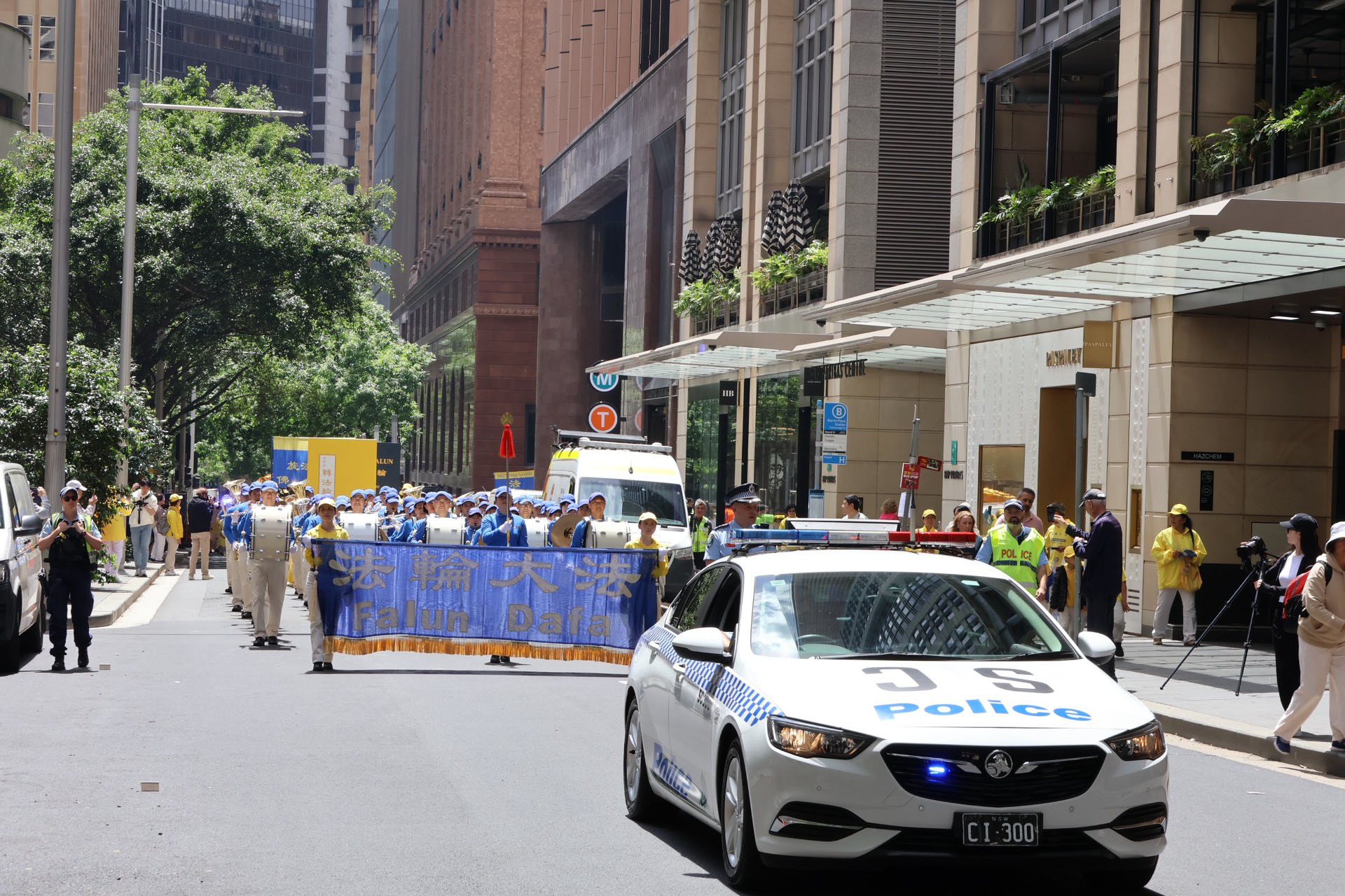 中午12点30分,浩浩荡荡的游行队伍由警车开道,从悉尼金融中心——马丁广场(Martin Place)出发。游行由三大方阵组成,分别是“法轮大法好”、“停止迫害法轮功”及“声援4.37亿勇士退出中共党、团、队”,展示了大法美好、二十五年反迫害以及“三退”大潮等真相信息。
