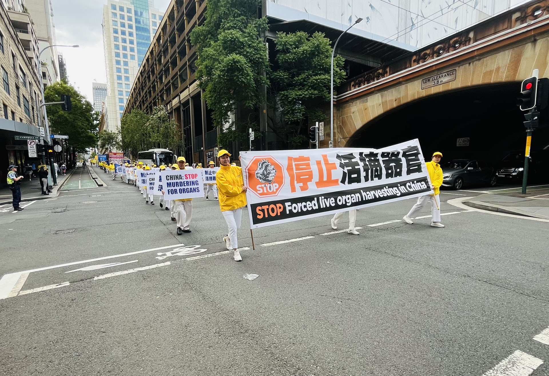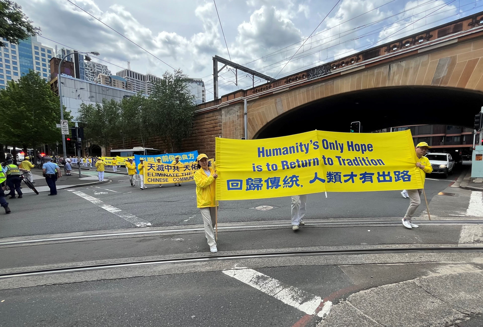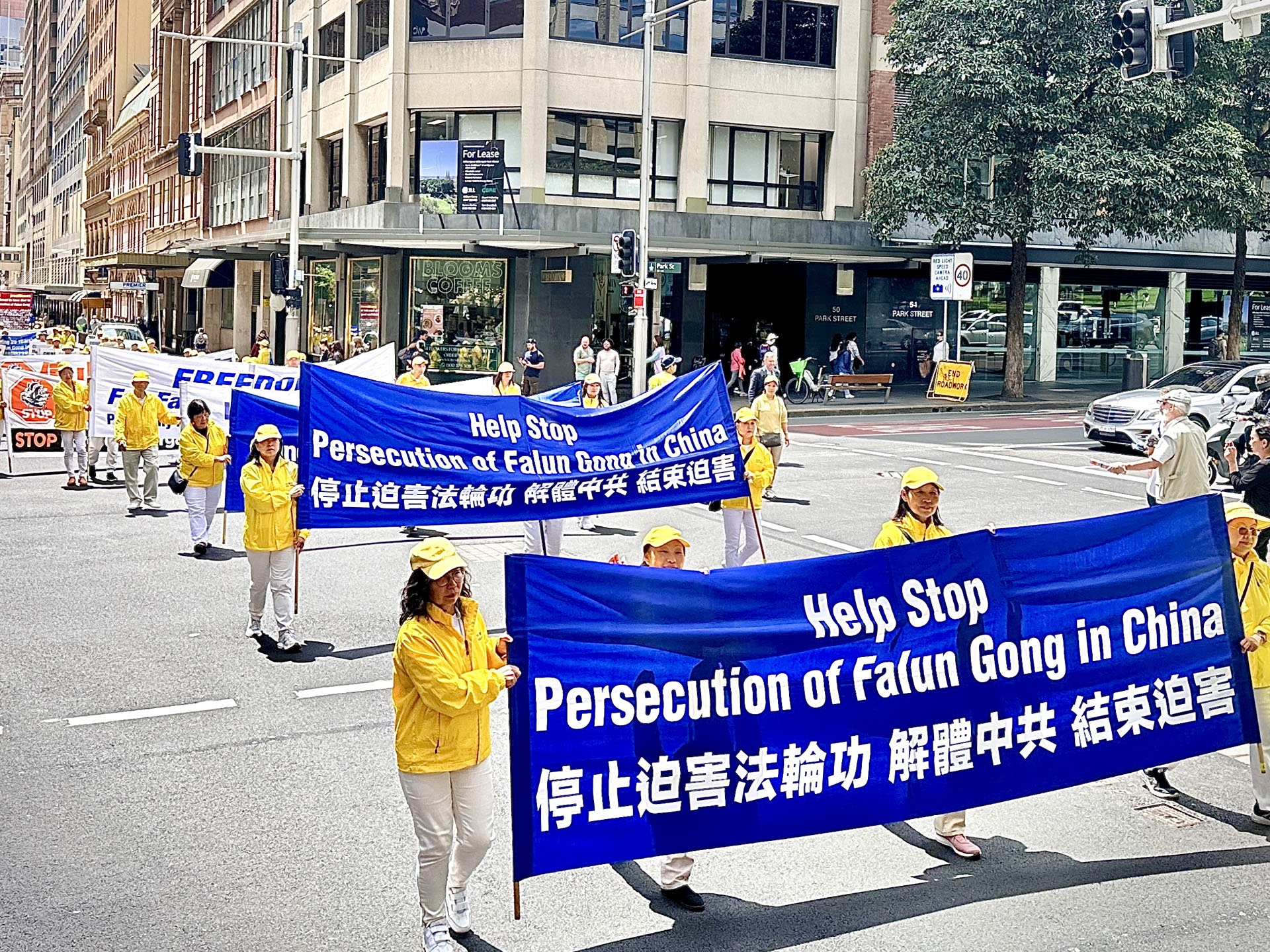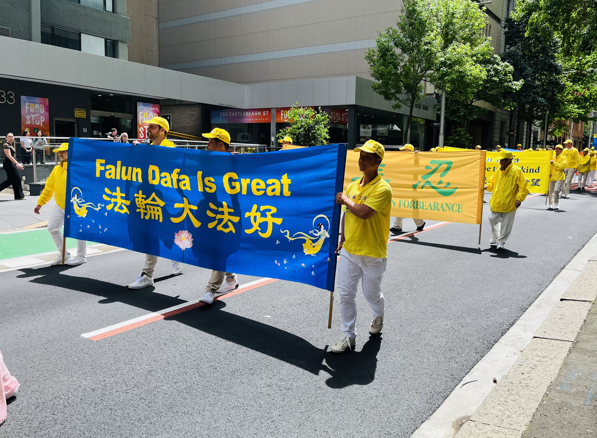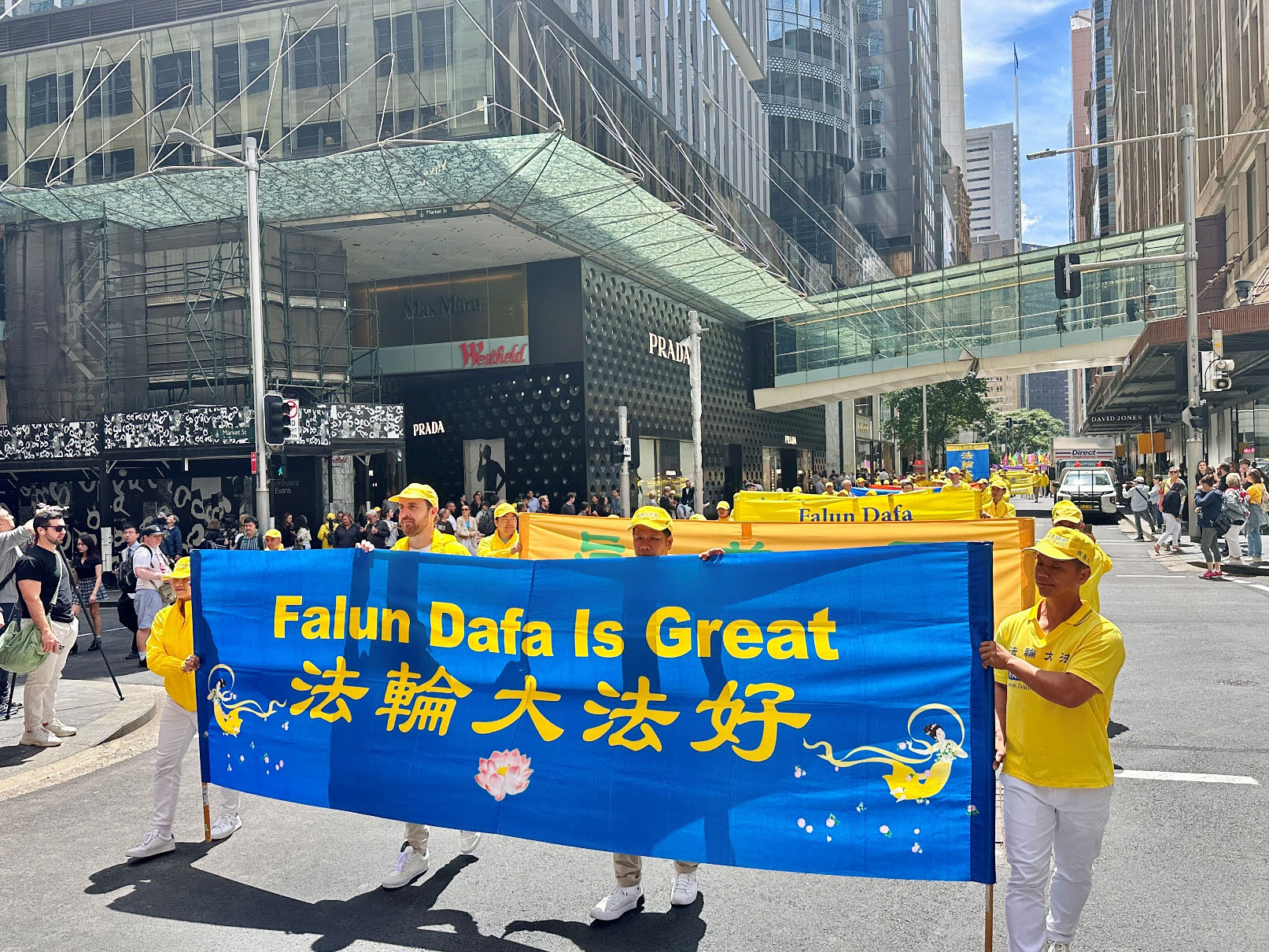 中午12点30分,浩浩荡荡的游行队伍由警车开道,从悉尼金融中心——马丁广场(Martin Place)出发。游行由三大方阵组成,分别是“法轮大法好”、“停止迫害法轮功”及“声援4.37亿勇士退出中共党、团、队”,展示了大法美好、二十五年反迫害以及“三退”大潮等真相信息。