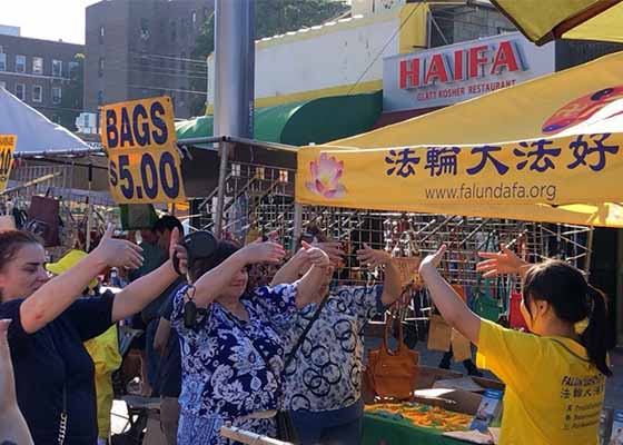 - 法轮功学员在纽约街市弘法 受到社区民众喜爱- 法轮功学员十月五日在纽约雷哥公园举办了街市弘法活动,受到社区民众好评。他们纷纷来到法轮功展位听闻了真相,签名支持结束中共。