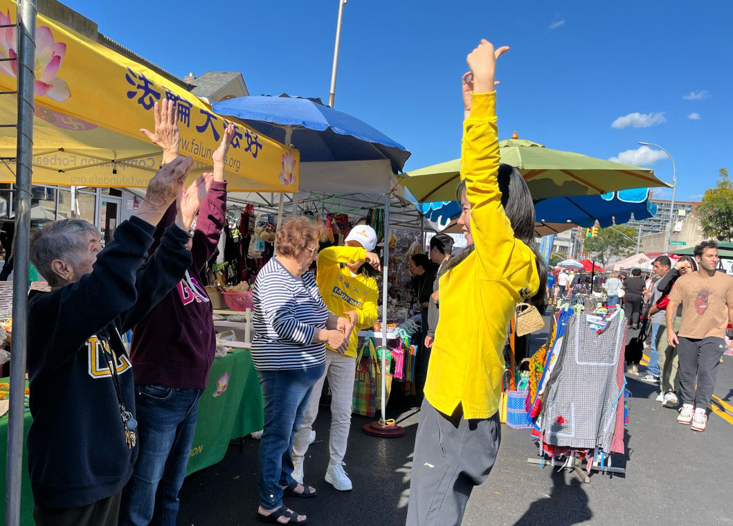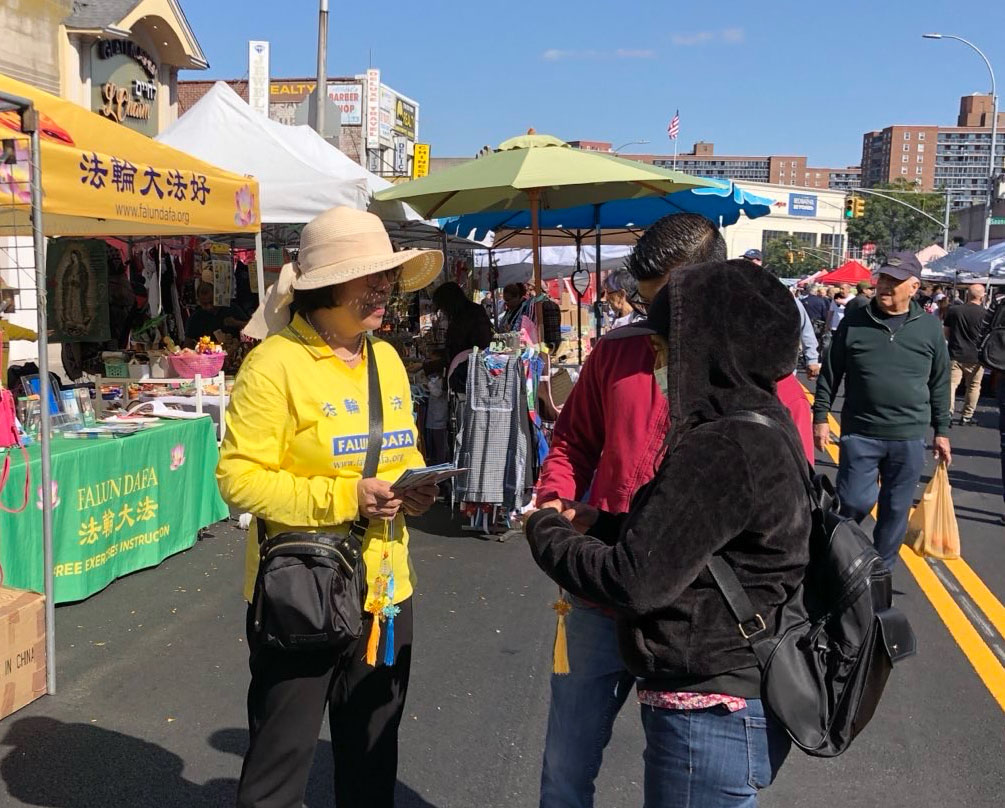 雷哥公园邻近埃姆赫斯特、可乐娜、森林小丘和中村,充满俄罗斯风情,街道上常见西里尔字母的招牌。区内移民多元化,包括来自乌兹别克斯坦、塔吉克斯坦、阿尔巴尼亚、以色列、罗马尼亚、伊朗、哥伦比亚、南亚、中国、保加利亚和韩国的居民。街市上来往的行人络绎不绝,法轮大法的展位也热闹非凡,许多有缘人前来了解真相,学员们准备了充足的英语、西班牙语的法轮功真相资料,传递给这些有缘人。