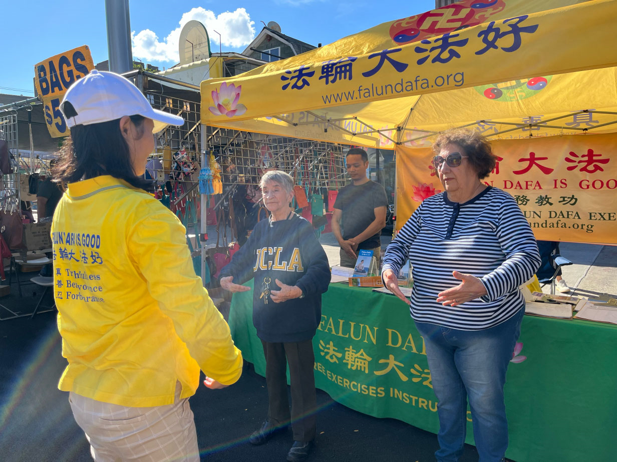 ![]() 图8:从小就来到美国的苏珊(Susan X)女士(右)在与法轮功学员交流。 |