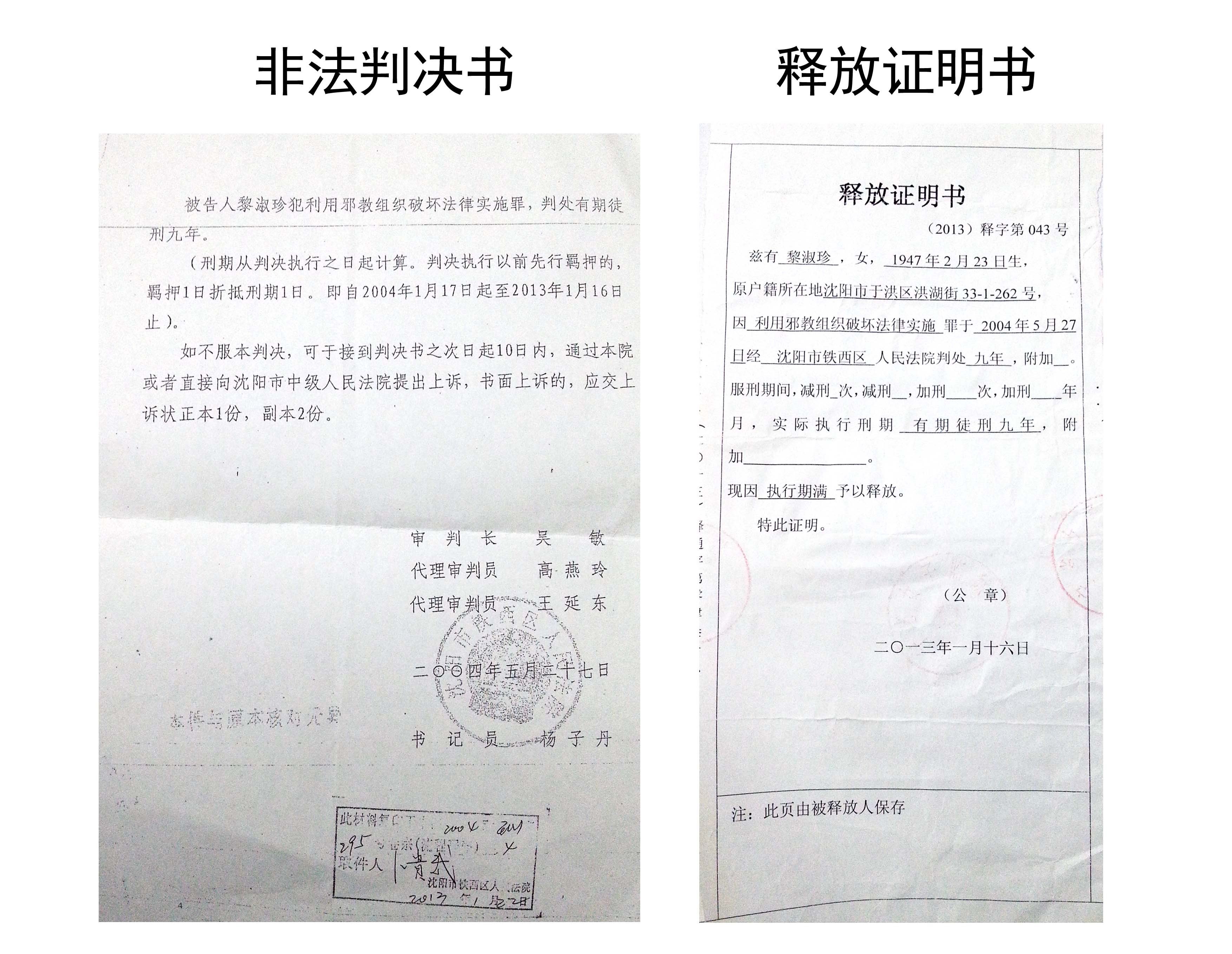 二零一三年一月十六日,黎淑珍终于结束了地狱般暗无天日的九年牢狱,回家后她本想与久别的亲人好好团聚、正常生活,却不断遭到当地派出所、社区、街道人员的骚扰,她和家人时常担惊受怕,生活不得安宁。可是还未等身心伤痛得以平复,黎淑珍又遭受了严重的经济迫害。