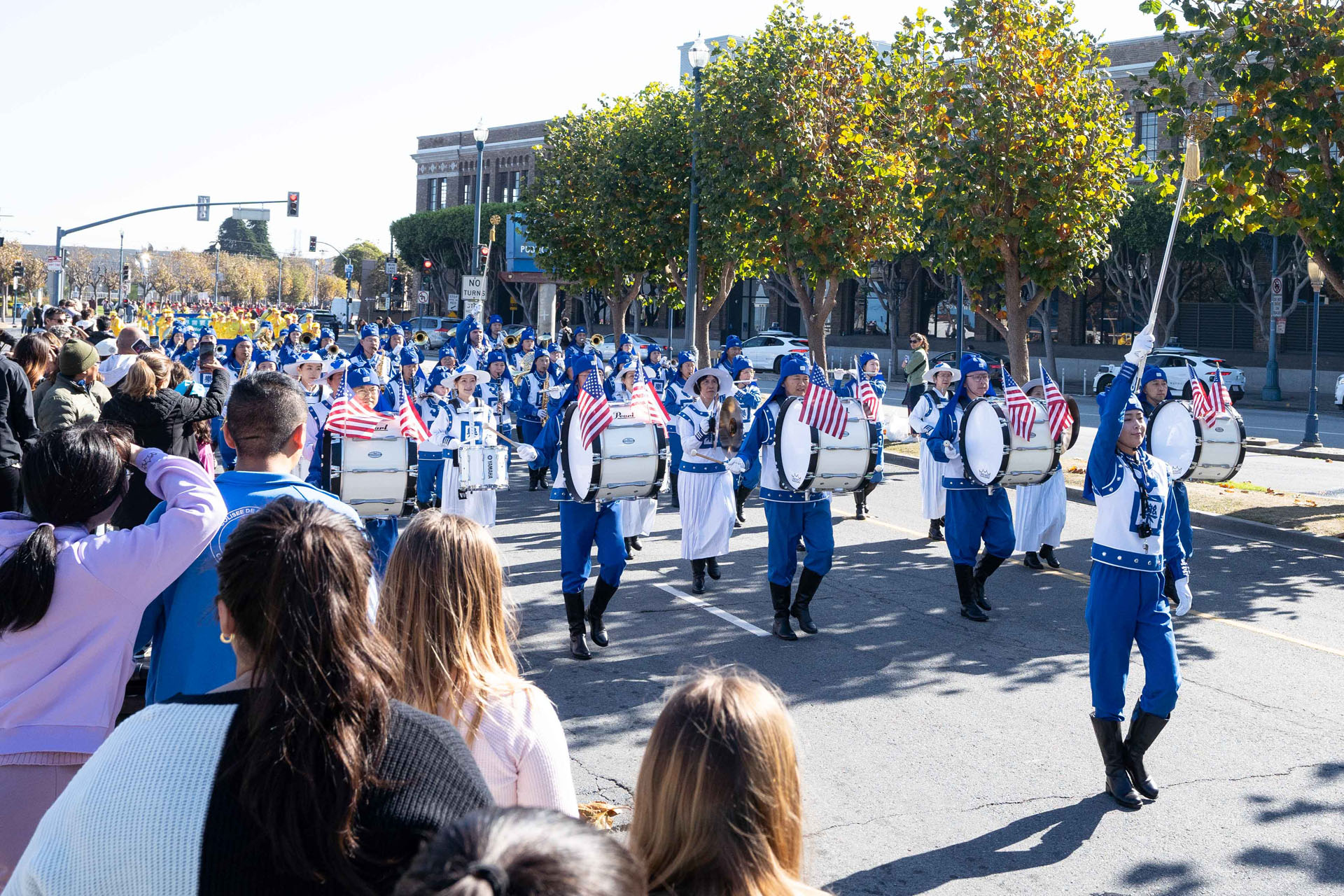 由法轮功学员组成的美西天国乐团、炼功队和腰鼓队伍经过主席台时,主持人向观众介绍说:现在来的是法轮功学员的游行队伍,法轮功是一种基于真、善、忍法理的性命双修功法。他们的演奏非常精彩,非常棒。