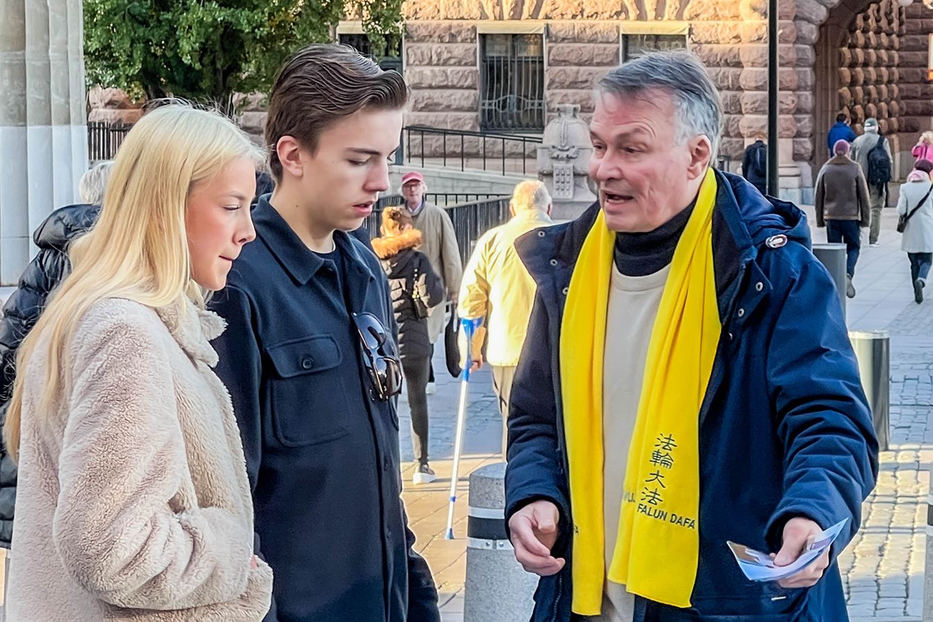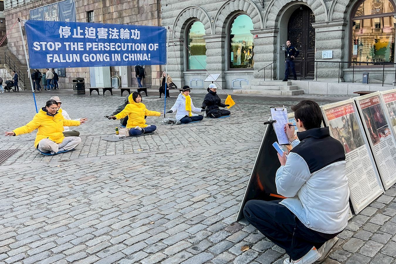 金秋十月是一年一度诺贝尔奖揭晓的季节。斯德哥尔摩是诺贝尔的故乡,也是旅游、户外爱好者的乐园。在熙熙攘攘的钱币广场,人们看到法轮功学员宁静祥和的炼功场面,了解了中共对信仰真、善、忍的群体实施的残酷迫害、以及活摘人体器官真相时,震惊又愤怒,纷纷签名支持反迫害。有不少对功法感兴趣的人,当场就学炼功动作。