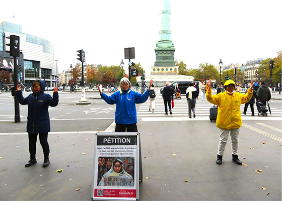 十一月三日,在法国巴黎巴士底广场上,法轮功学员进行了法轮功功法演示、讲真相和征签活动,吸引了很多居民和游客驻足了解真相。