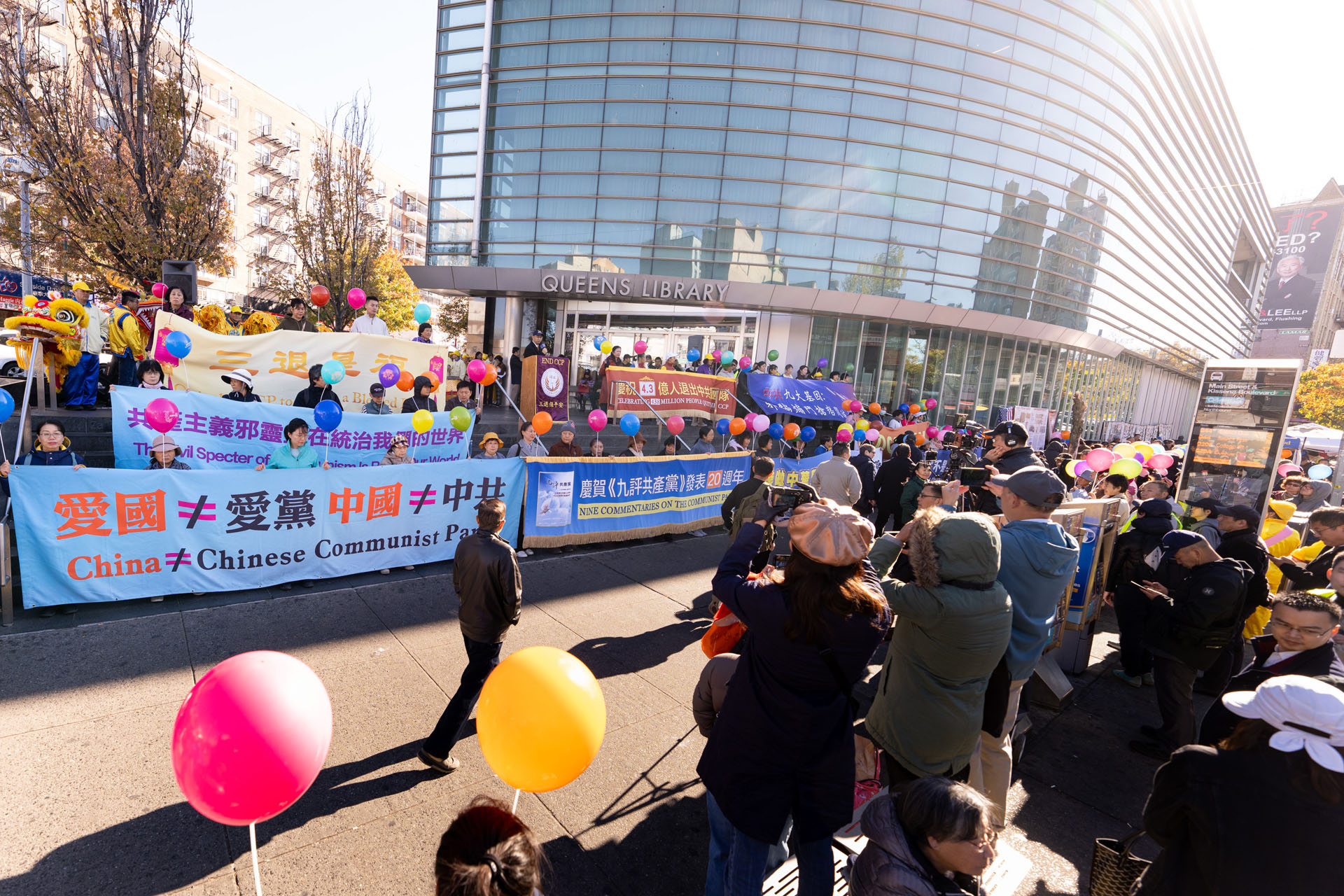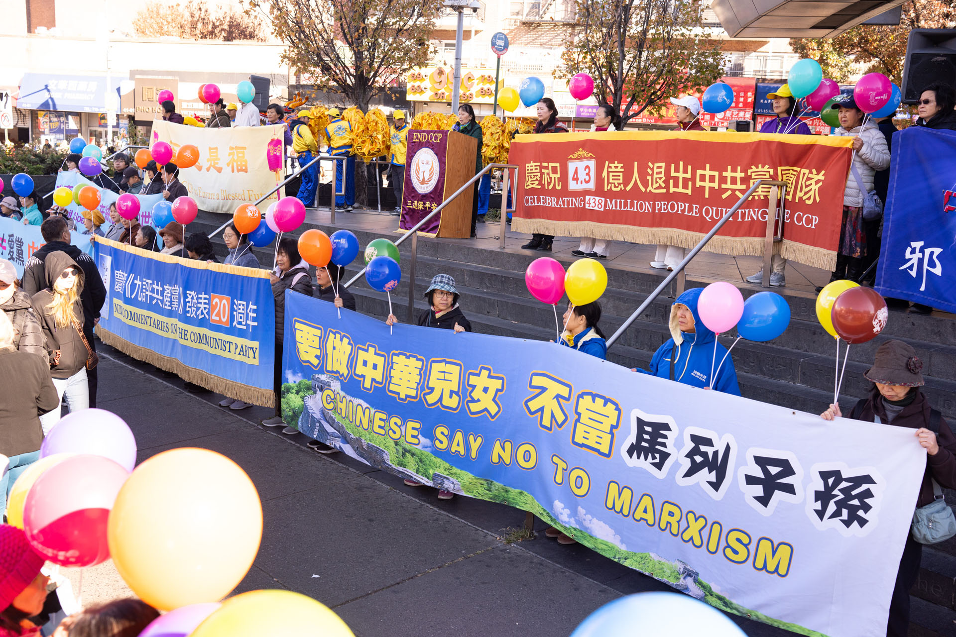 当天阳光普照,法拉盛中心区缅街熙熙攘攘,人流如织。嘉宾们的演说通过扩音器传播到大街上,路人站在街道两旁静静倾听,还有很多人走近观看集会上的标语,其中有“中共≠中国”“爱国≠爱党”“天机显现 中共灭亡”“退出党团队 选择美好未来”等。