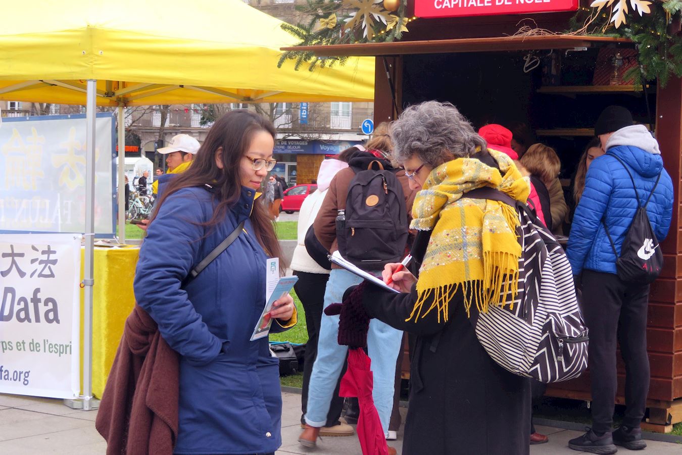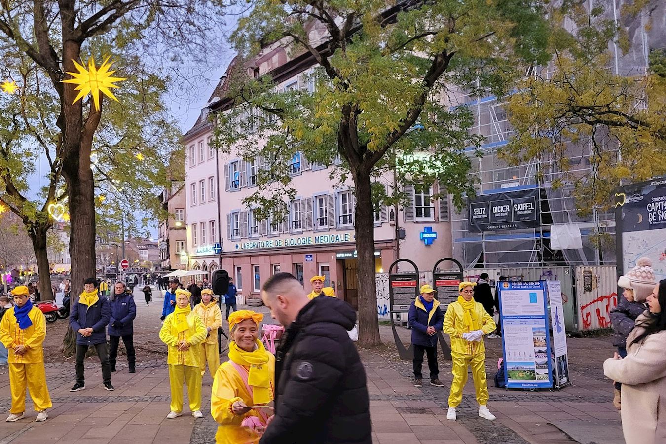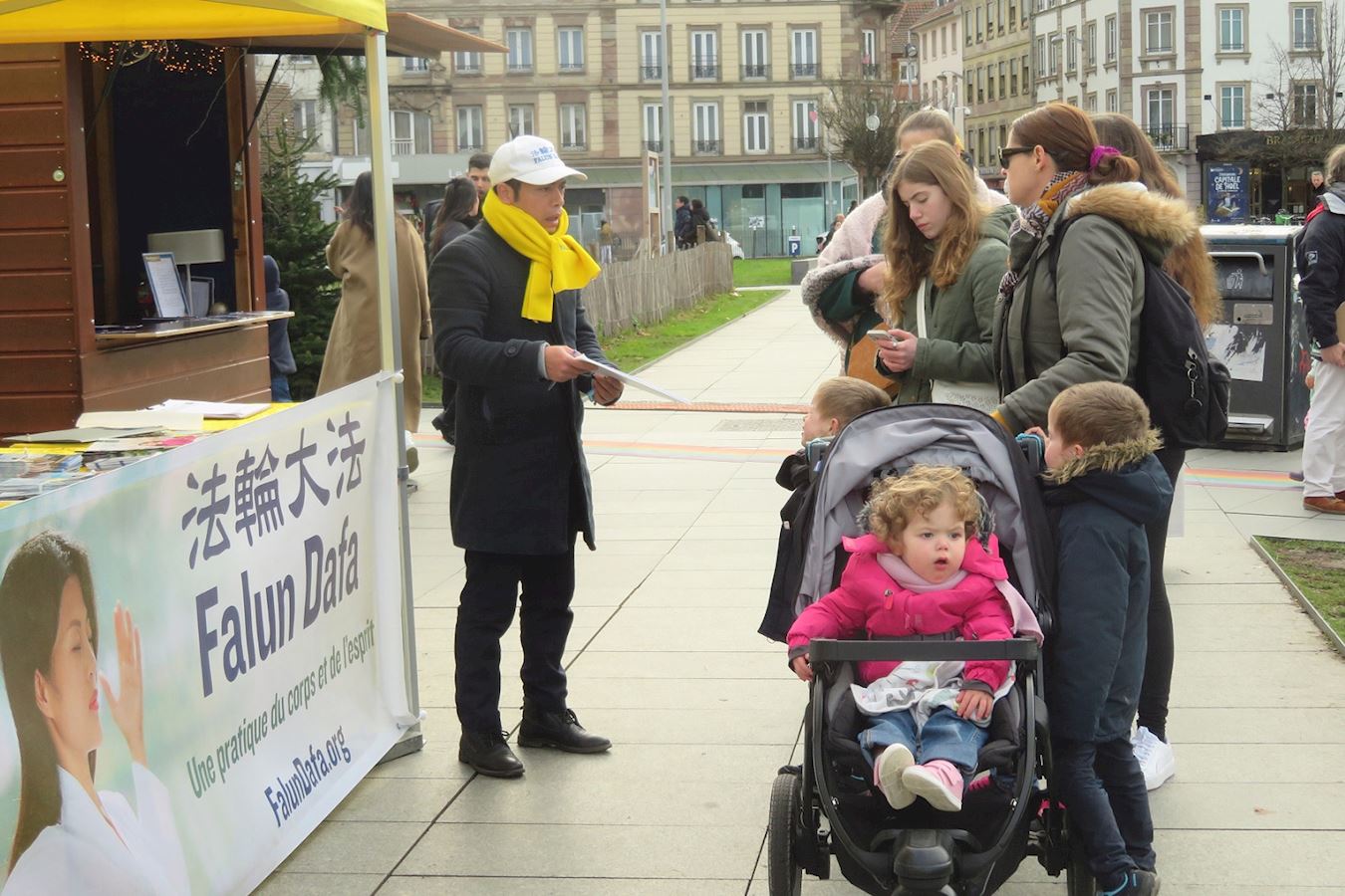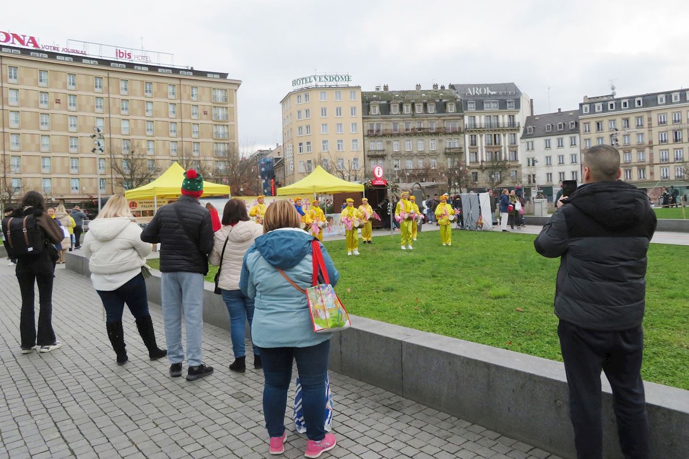 正值圣诞市场开启,人流量很大。连续两天,在火车站广场、奥斯特利茨广场(Place Austerlitz)和科尔博广场(Place du Corbeau)分别设立了真相点,法轮功学员的功法演示、腰鼓,吸引了很多游人民众驻足观看并前来了解真相。