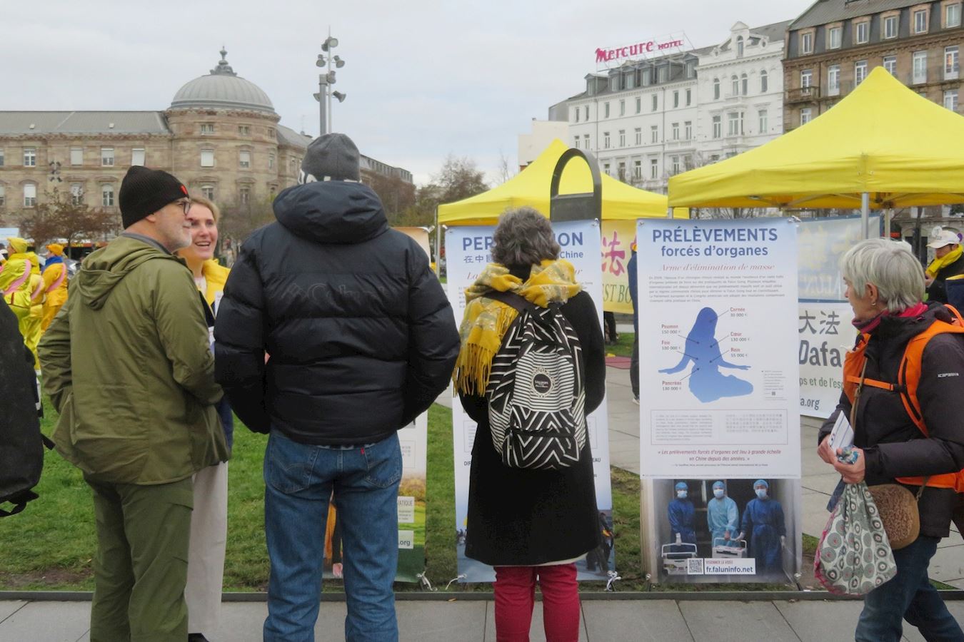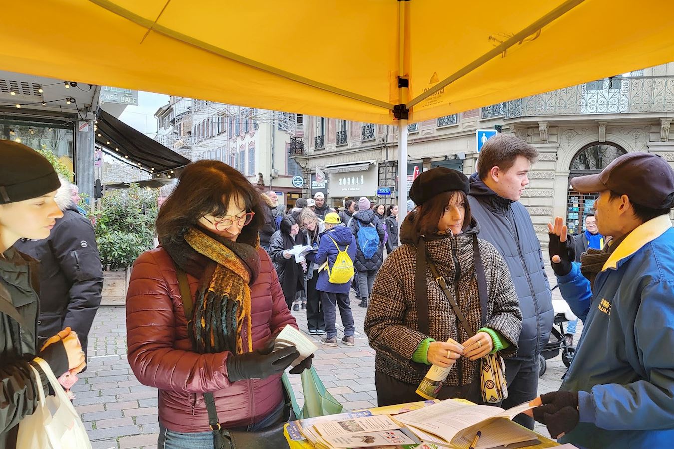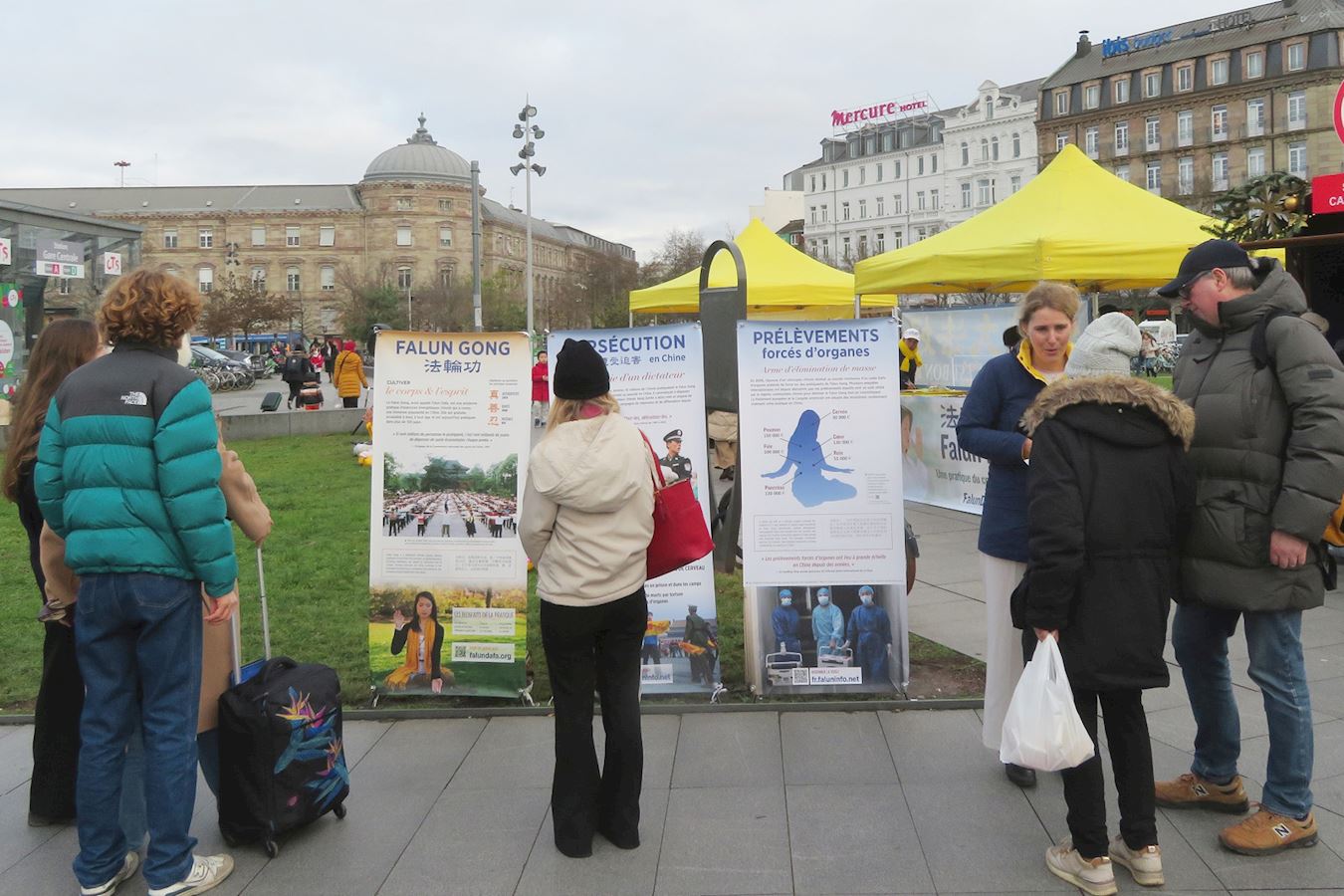 正值圣诞市场开启,人流量很大。连续两天,在火车站广场、奥斯特利茨广场(Place Austerlitz)和科尔博广场(Place du Corbeau)分别设立了真相点,法轮功学员的功法演示、腰鼓,吸引了很多游人民众驻足观看并前来了解真相。