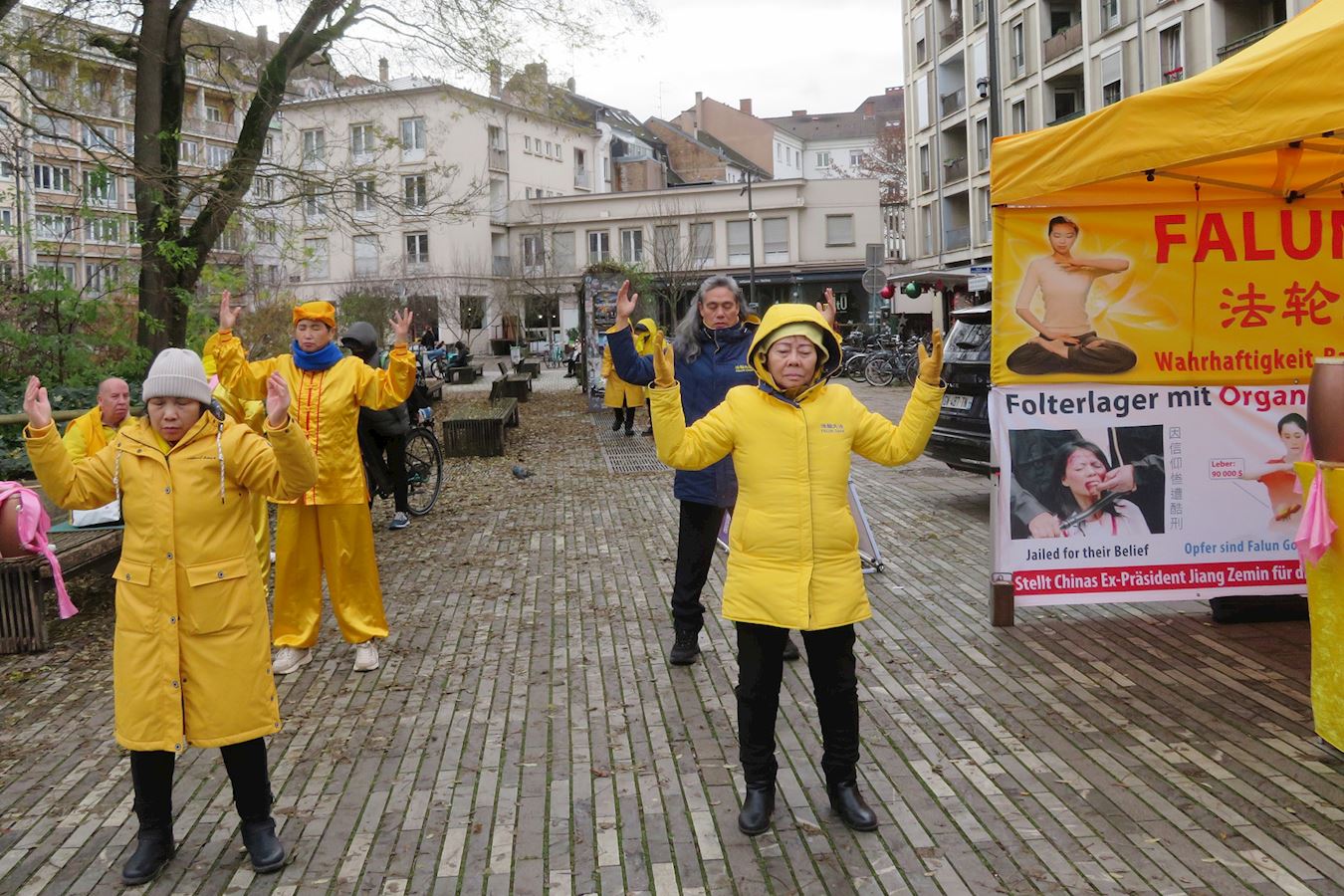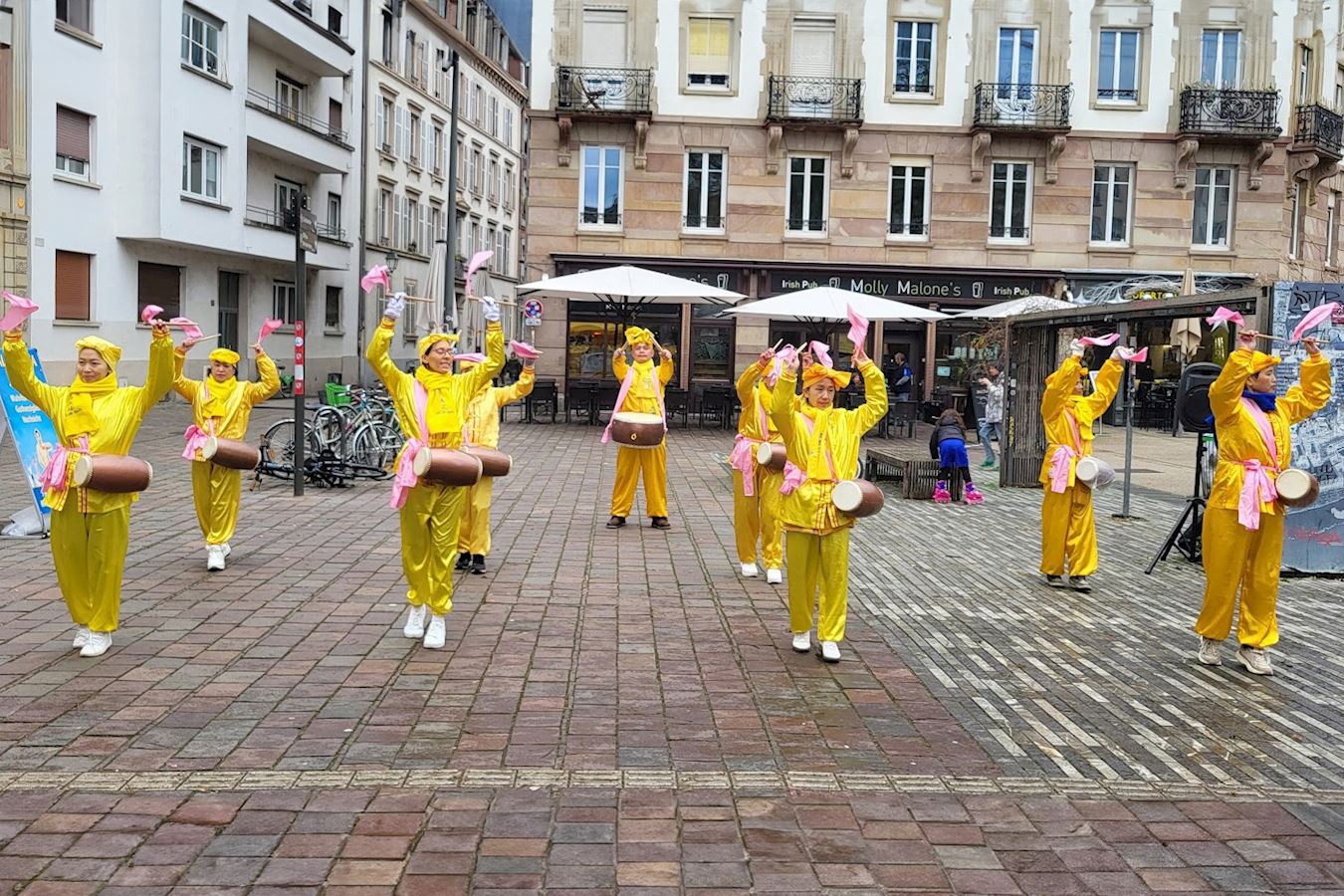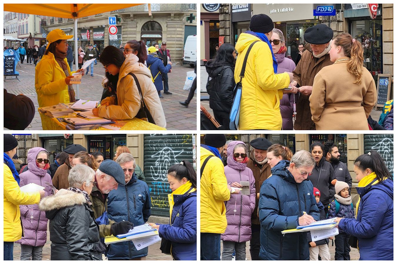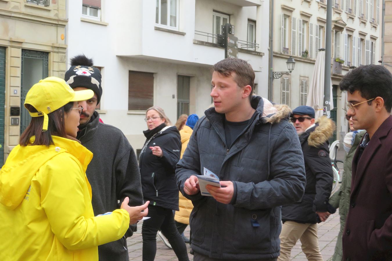 正值圣诞市场开启,人流量很大。连续两天,在火车站广场、奥斯特利茨广场(Place Austerlitz)和科尔博广场(Place du Corbeau)分别设立了真相点,法轮功学员的功法演示、腰鼓,吸引了很多游人民众驻足观看并前来了解真相。