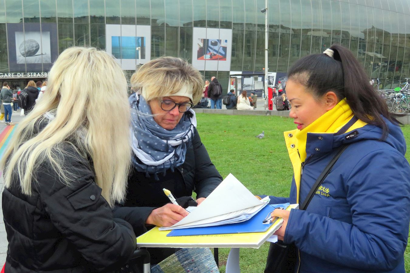 图6~8:在斯特拉斯堡市中心火车站广场,人们在反迫害征签表上签字。