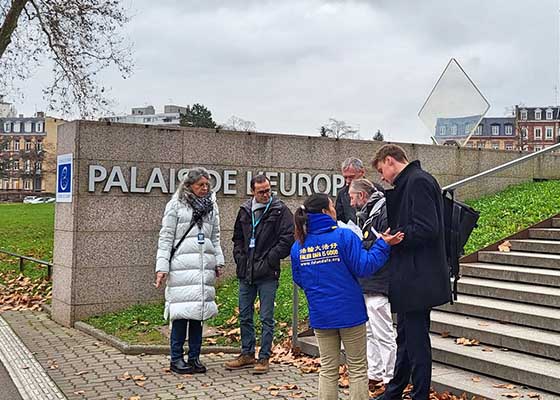 法轮功学员12月9日在法国东部斯特拉斯堡的欧洲理事会前,向人们介绍法轮功,揭露中共迫害法轮功的罪行,呼吁各界人士共同制止迫害。