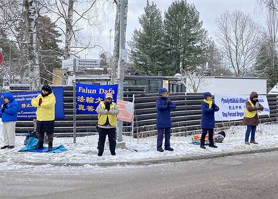 - 国际人权日 芬兰民众支持法轮功反迫害- 国际人权日前夕,芬兰法轮功学员在赫尔辛基中共大使馆门前举办了和平抗议活动,并在市中心干比广场举办烛光悼念活动。
