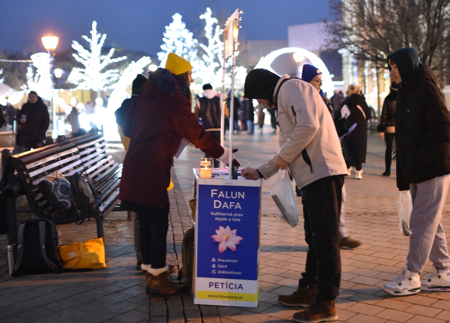 十二月十四日,在斯洛伐克西部城市尼特拉,法轮功学员在斯特法尼科街(Stefanik)举行请愿活动。尽管天气寒冷,许多路人还是停下来签名,呼吁制止迫害。