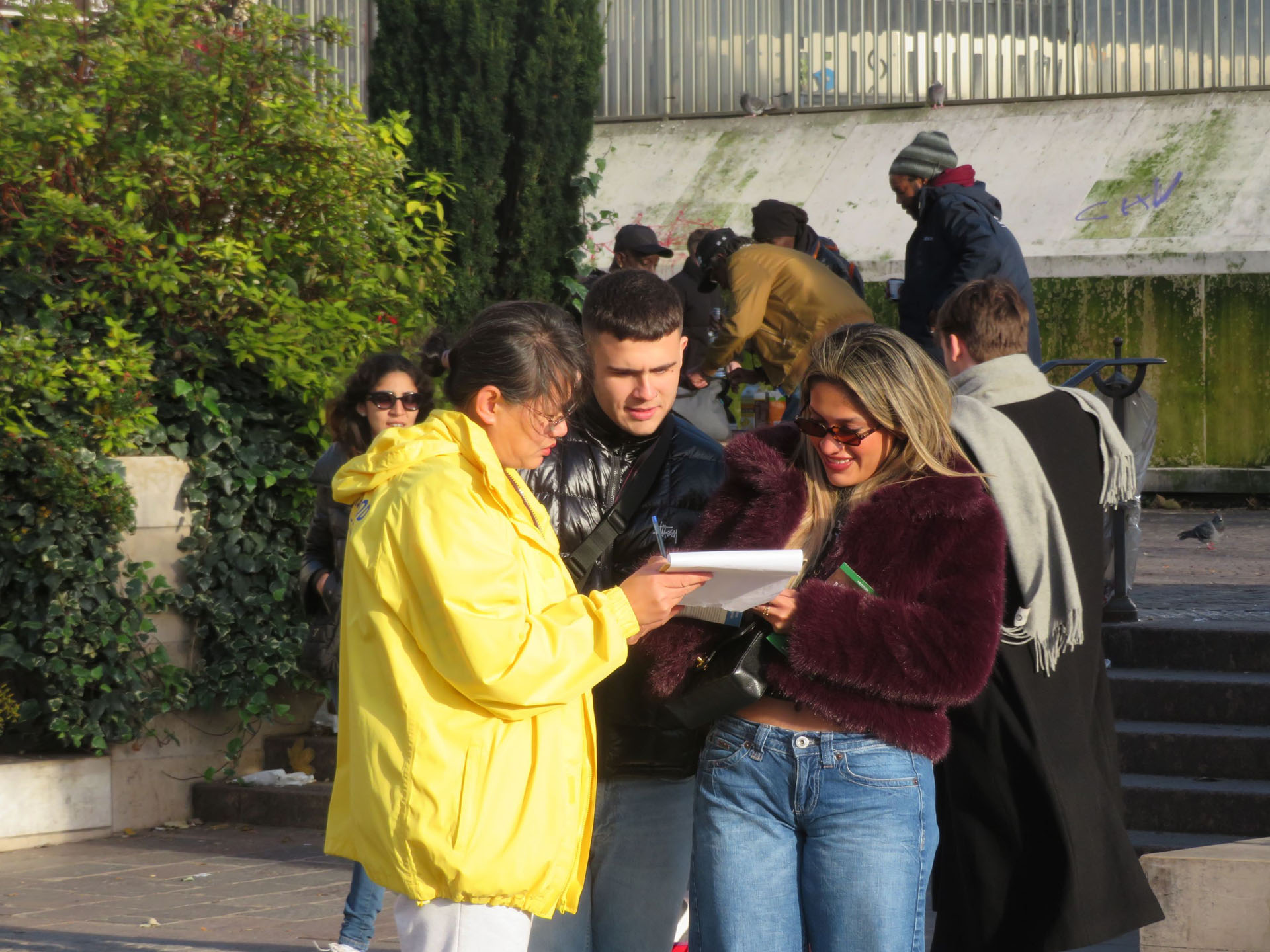 当天天气晴朗,空气清新。人群中,社会各阶层人士,大学生、教师、艺术家、退休人士等,纷纷前来了解法轮功真相及中共活摘器官的罪行。人们逐渐认清中共的邪恶,一听说反对中共迫害,就毫不犹豫地立即签名支持反迫害。他们都要表达一个共同的心愿,那就是早日结束迫害!
