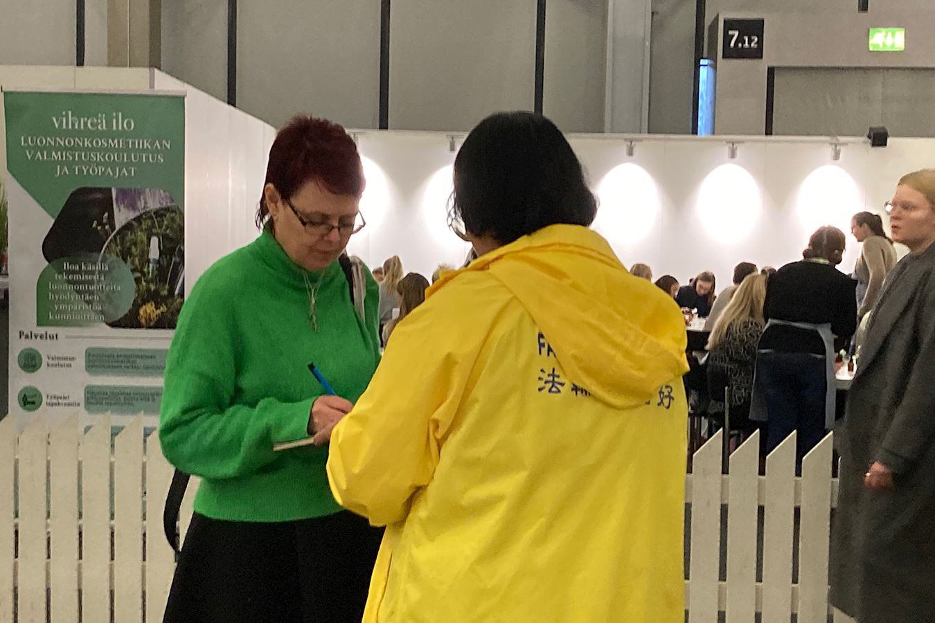 内塔·纳尔希(Netta Närhi)是一名社工,她知道中国的人权现状非常的糟糕,她把网络反迫害征签的网站用手机拍下来发给她的朋友。这是她第一次听到活摘器官的事情,她说:“真是太糟糕了。中国是没有自由,我很遗憾。每个人都应该自由,每个人有自我决策的自由。”离开时,她还拿走一叠资料,表示在会展室里,她会帮忙发给更多的人。