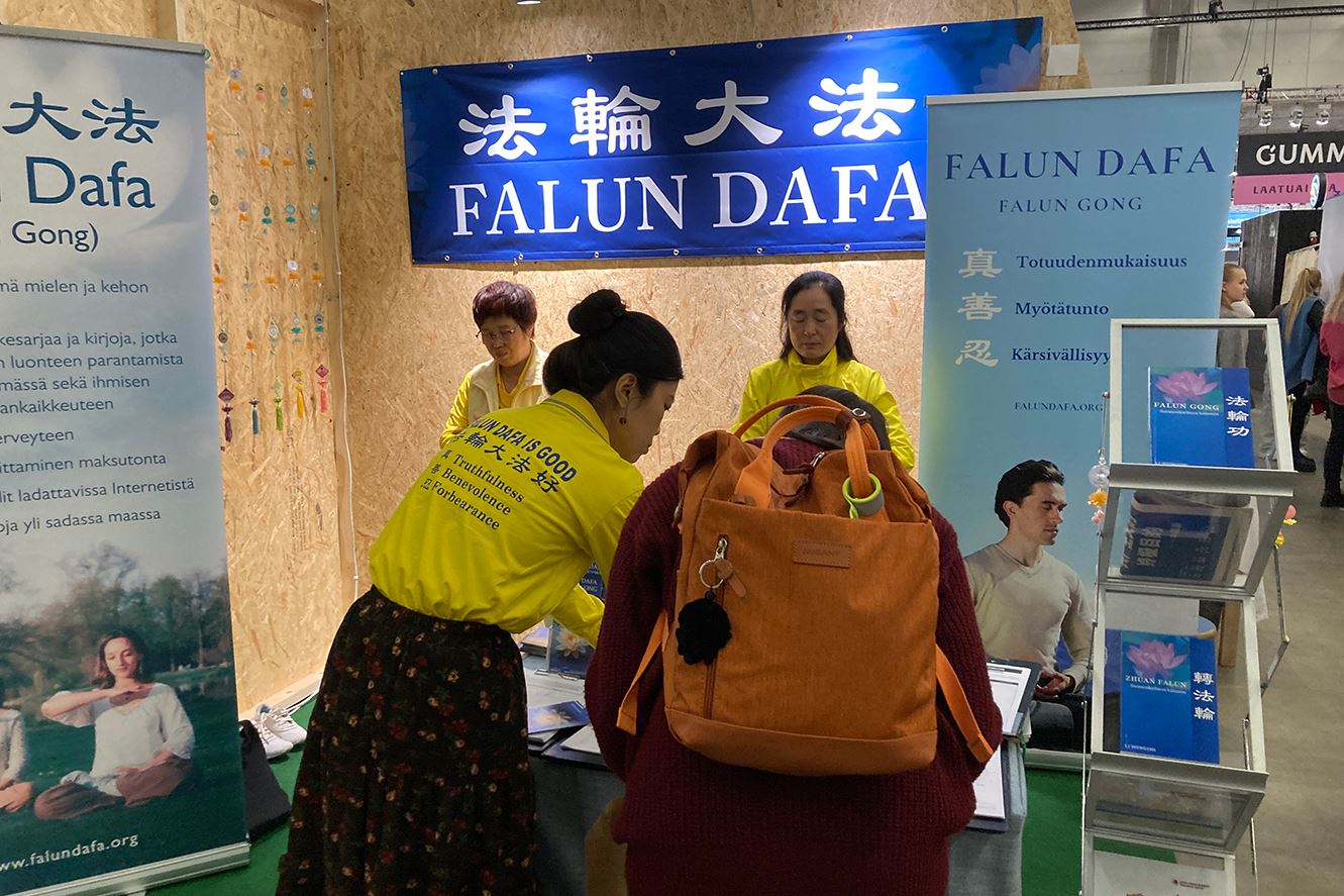 跟她一起的朋友小心翼翼地打开放在架子上的芬兰语《转法轮》看起来,她很惊讶地说她明白书中讲的是什么。在现场,她跟学员学起法轮功功法。学完后说非常舒服,平和,能让她紧张的身体放松下来了。